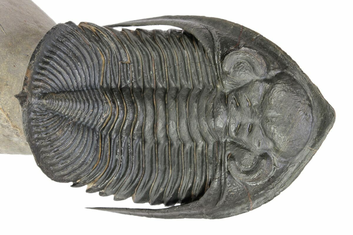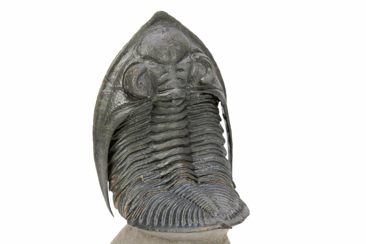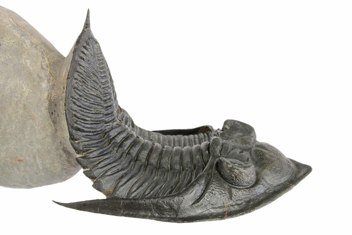 This is a uniquely prepared, 3.5" long Dalmanitid trilobite (Zlichovaspis rugosa) quarried near Atchana, Morocco. Nearly all of the surrounding limestone has been removed, so that it appears to "fly" above the stone base. Excellent shell detail and good eye facet preservation and less than 1% shell restoration.