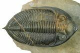 This is a uniquely prepared, 3.5" long Dalmanitid trilobite (Zlichovaspis rugosa) quarried near Atchana, Morocco. Nearly all of the surrounding limestone has been removed, so that it appears to "fly" above the stone base. Excellent shell detail and good eye facet preservation and with 1-2% shell restoration along a repaired crack.