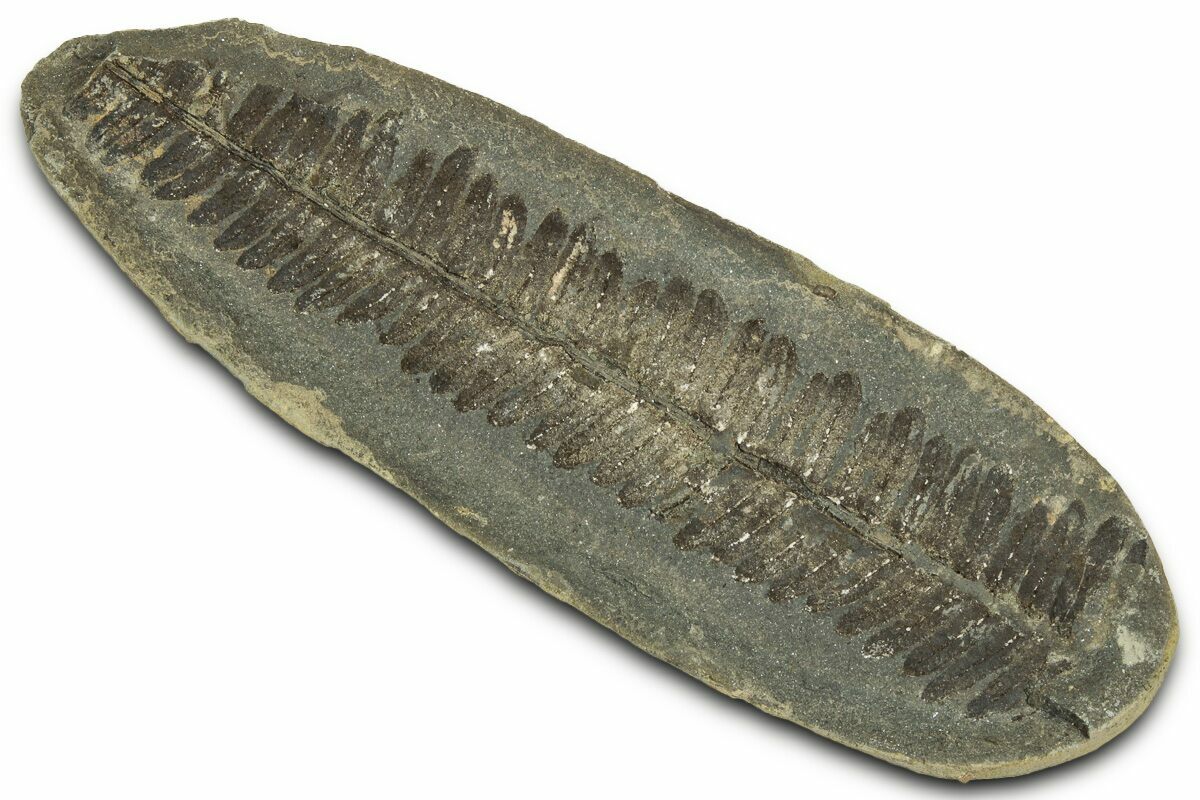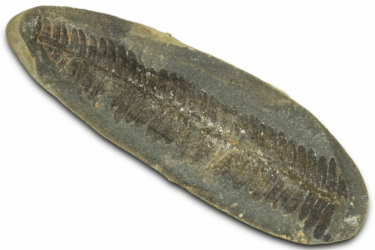 This is a 3.5" fern fossil (Pecopteris sp.) from the Carbondale Formation (Francis Creek Shale) in Braidwood, Illinois. It is preserved inside an ironstone nodule associated with the famous Mazon Creek Lagerstätte. Under magnification the detail of this specimen stands out. Both the positive (convex) and negative (concave) sides of the fossil nodule are included.