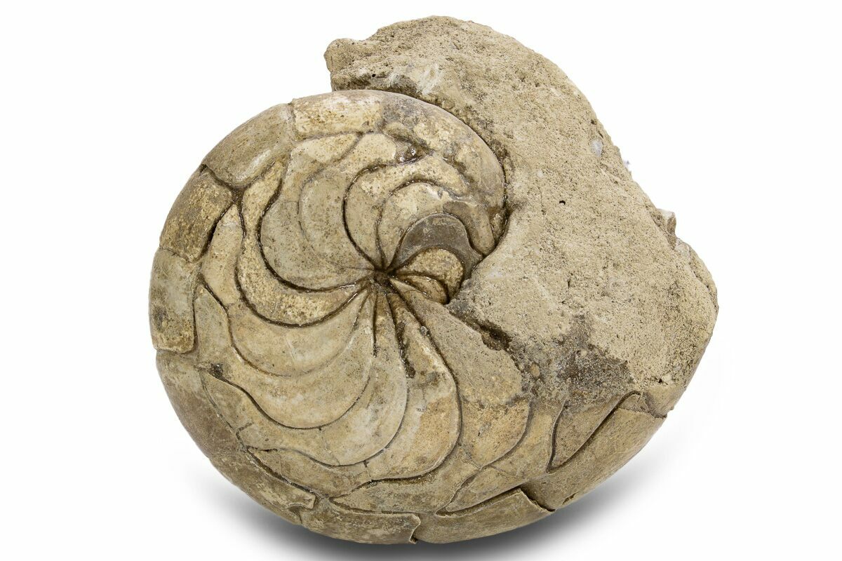 This is a stunning, 3.5" wide, Eocene aged nautilus (Aturia sp) fossil collected near Boujdour in Southwest Morocco. It has been nicely prepared to show off it's beautiful suture pattern, which is one of the more complex of all nautiloids.