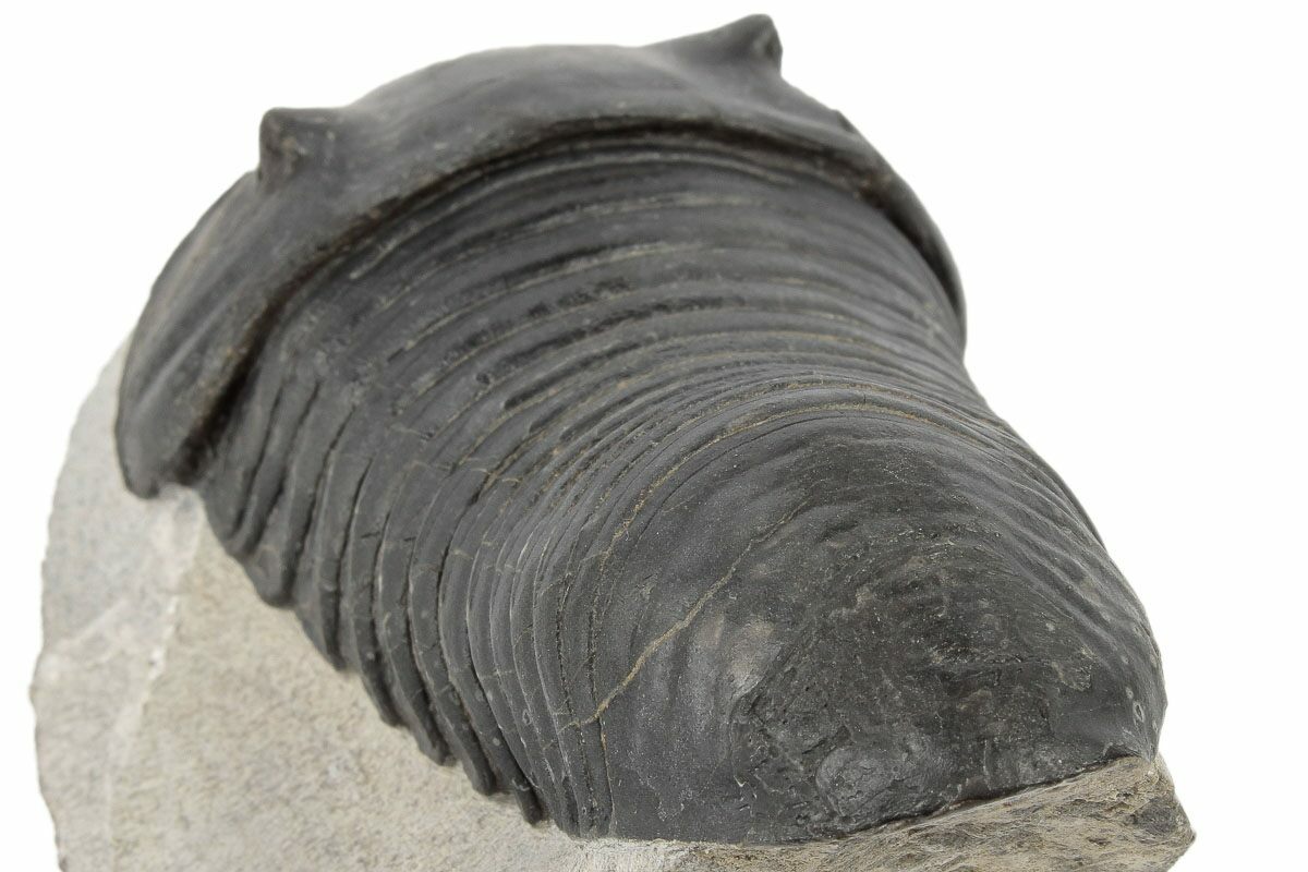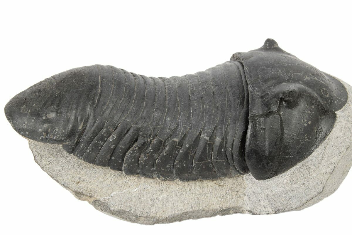 This is an uncommon Wenndorfia plana trilobite from Bou Lachrhal, Morocco. This specimen is 3.5" long and extremely inflated. The shell nearly always flakes badly on this species during collection, but restoration on this example is pretty minimal. About 3% in total, a patch on the tail and some on the left cheek.