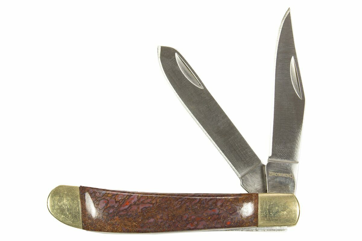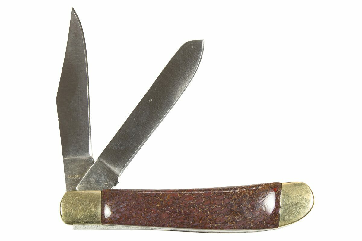 This high-quality pocket knife is a stunning blend of natural history and functional artistry. Handcrafted in Utah, it features a handle made from genuine red dinosaur gembone sourced from the Morrison Formation, dating back approximately 150 million years to the Late Jurassic period. The fossilized bone is polished to reveal vivid red hues and intricate, cell-like structure, making each knife a unique and eye-catching work of art.