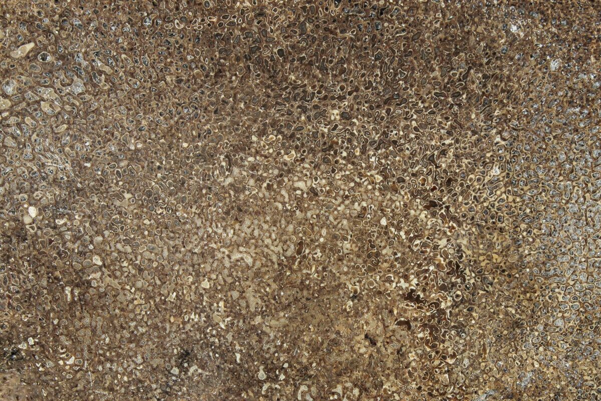 This is a 3.5" wide polished slab of agatized dinosaur bone. The polishing has exposed the bone's inner cell structure, showing off wonderful coloration and definition. Based on the size of the cells as well as other features of the bone, it is almost certainly sauropod in origin.