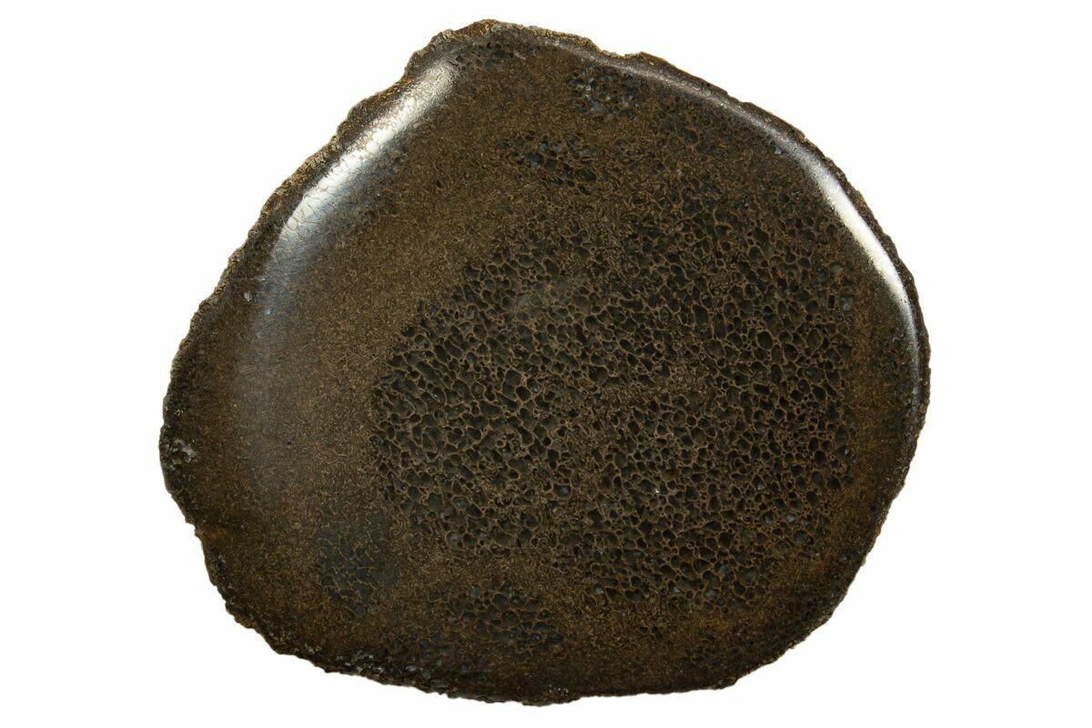 This is a 3.5" wide piece of polished bone from a pliosaur (Stretosaurus (Pliosaurus) cf. macromerus). It comes from the Middle Jurassic - Kimmeridgian Stage (154 million year old) deposit in Abingdon, England. This bone has been cut into a slab and polished on one side to reveal the beautifully preserved, agatized cell structure.