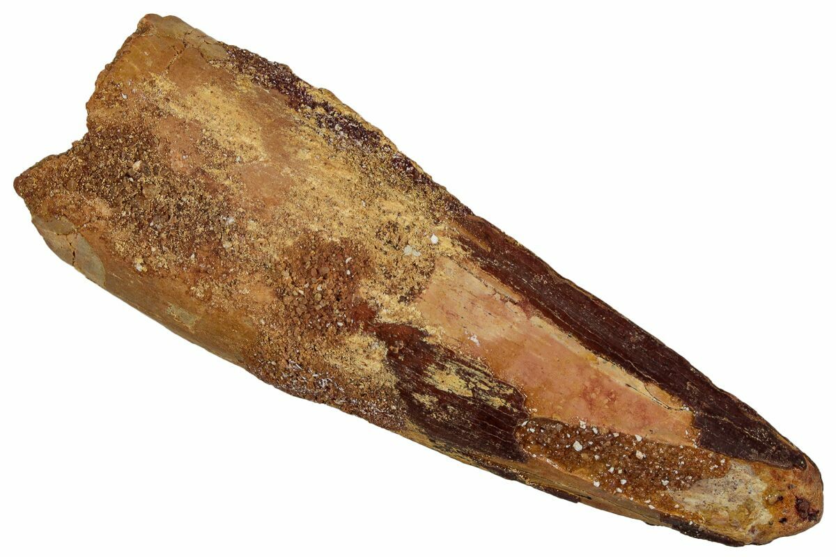 This is a 3.50" long Spinosaurus tooth from the Kem Kem Beds of Morocco. It is Late Cretaceous in age, approximately 95 million years old.