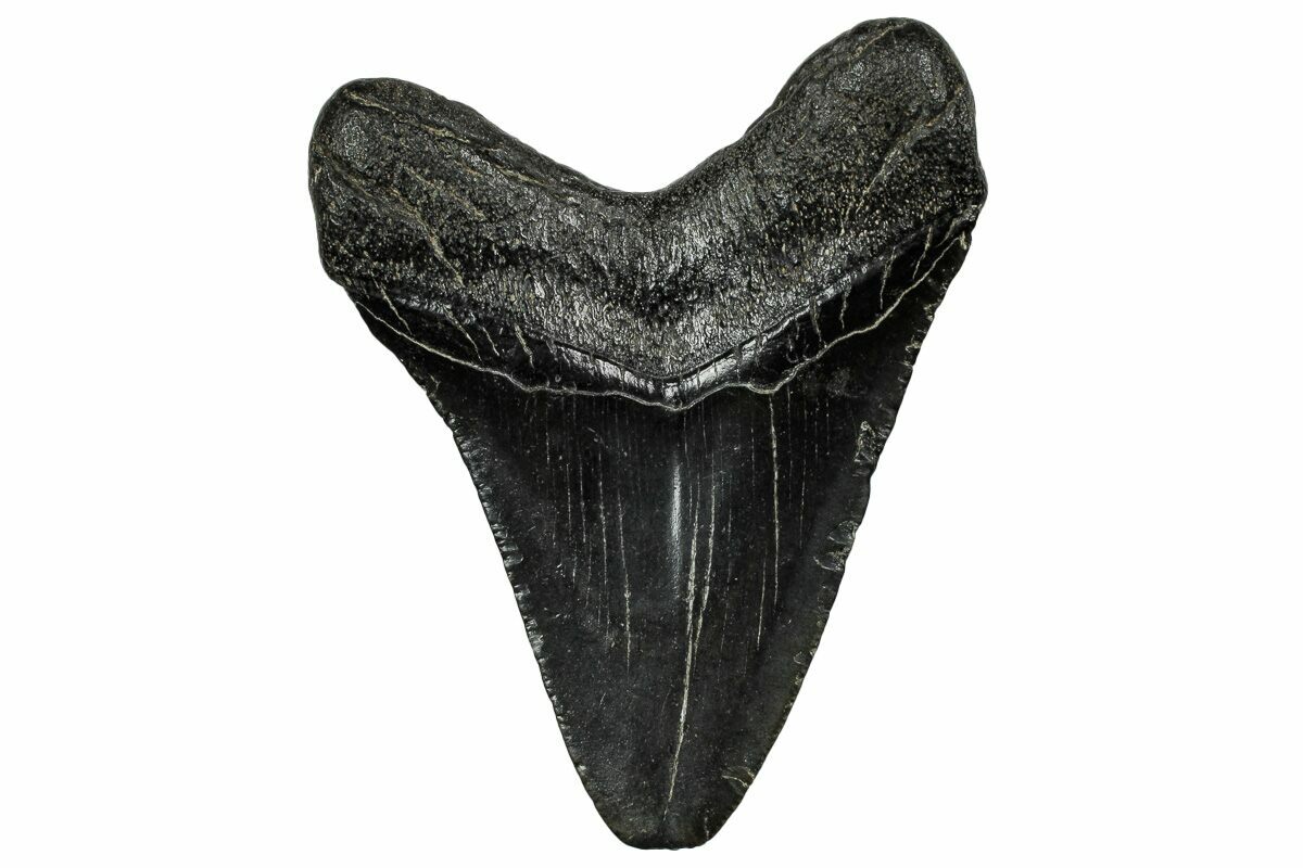 The standard measure for megalodon teeth is slant height, or the longest edge of the tooth. Adult megalodon teeth were typically in the 4 to 5 inch range: teeth over 6 inches are rare and represent super-sized individuals. Only a handful of teeth have ever been found over seven inches.