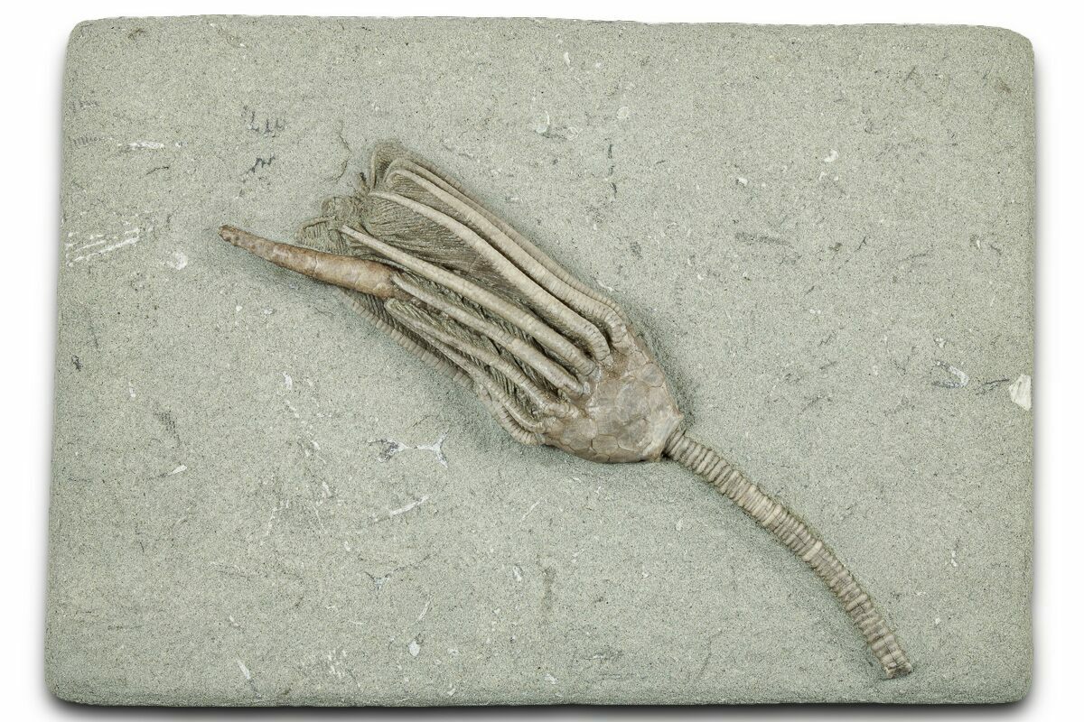 Crinoids from the Ramp Creek Limestone were likely buried in sediment from nearby deltas during storms. The resulting siltstone deposits are soft enough that fossils can be extracted in exquisite, three-dimensional relief.