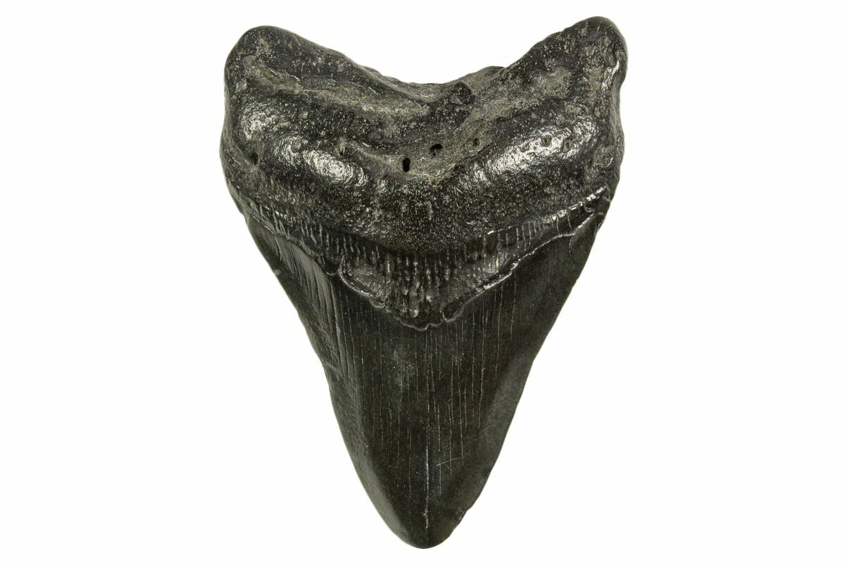The standard measure for megalodon teeth is slant height, or the longest edge of the tooth. Adult megalodon teeth were typically in the 4 to 5 inch range: teeth over 6 inches are rare and represent super-sized individuals. Only a handful of teeth have ever been found over seven inches.