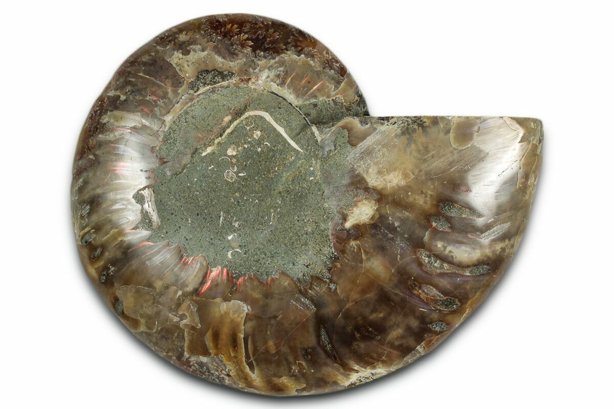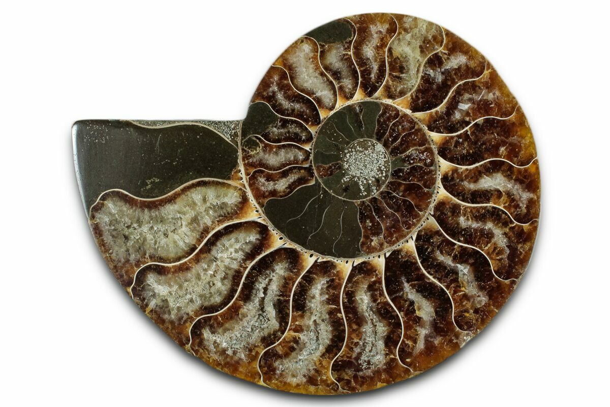 Here is a beautiful, 3.6" wide, cut and polished Cleoniceras ammonite fossil from Madagascar. These ammonites are Cretaceous in age, approximately 110 million years old. This specimen exhibits gorgeous mineralization within the chambers, each separated by white calcite septa (divisions). This highly polished, exotic ammonite makes a superb display piece with tremendous historical appeal.