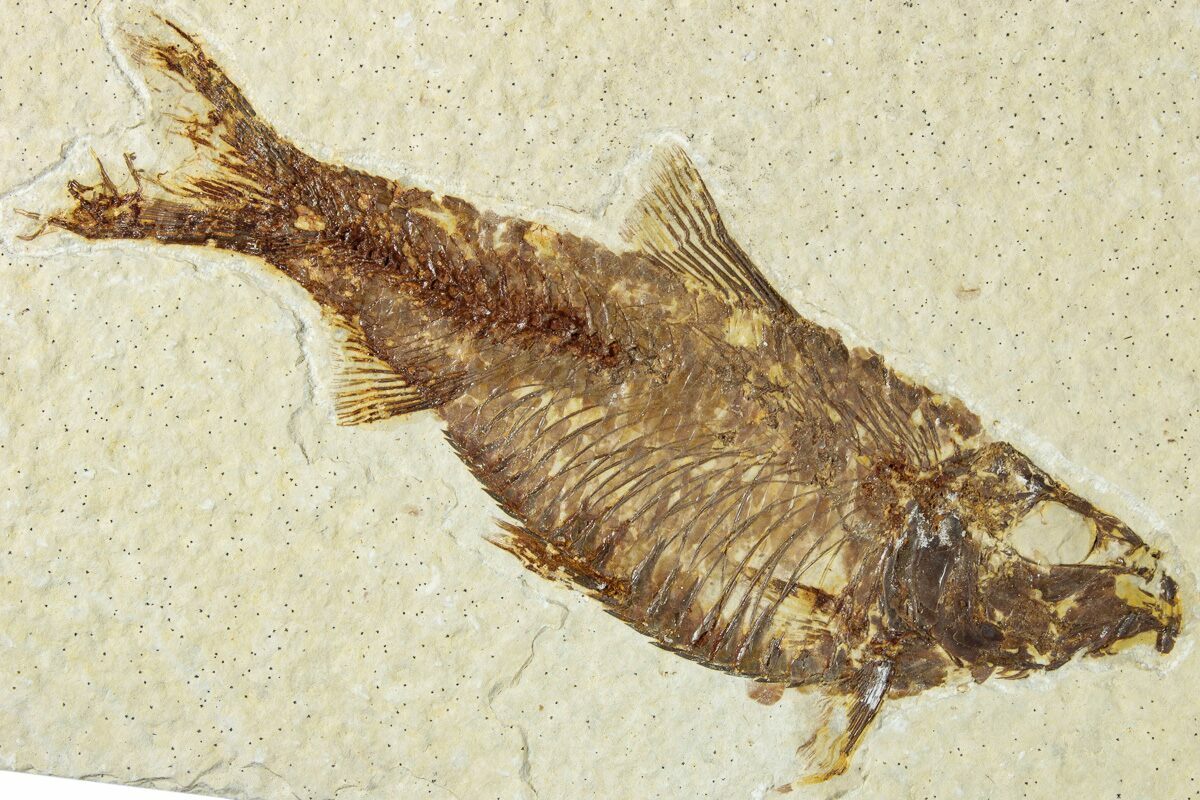 This is a 3.6" long fossil fish (Knightia eocaena) from our Fossil Lake Safari quarry near Kemmerer, Wyoming. Its bone structure, fins, and scale structure are visible.
