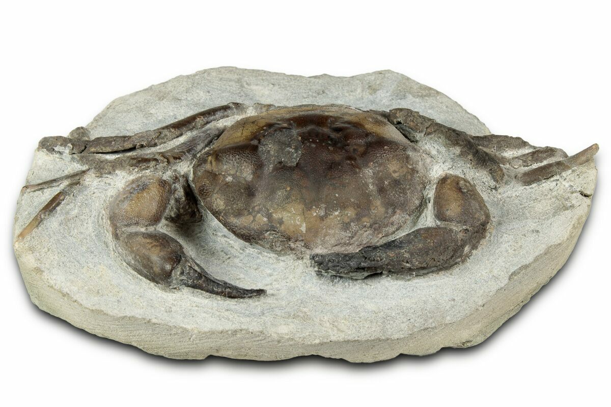 This is a wonderfully prepared example of the Late Eocene aged fossil crab Pulalius vulgaris. These crabs are found within hard concretions (a mass of rock that forms around organic manner) that erode out of the Lincoln Creek Formation, which must be broken open to find the crab. The crab must then be prepared from the hard concretion using mechanical tools, a very time consuming process.