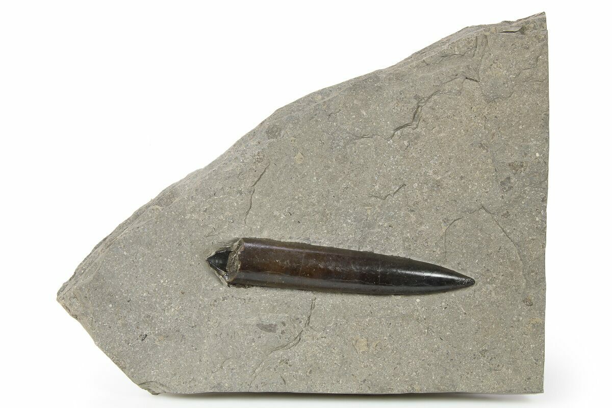 This is a 3.6" long fossil belemnite (Acrocoelites sp.) from the Jurassic-aged Posidonia Shale of Holzmaden, Germany. The belemnite has been exposed from the rock it was found in.