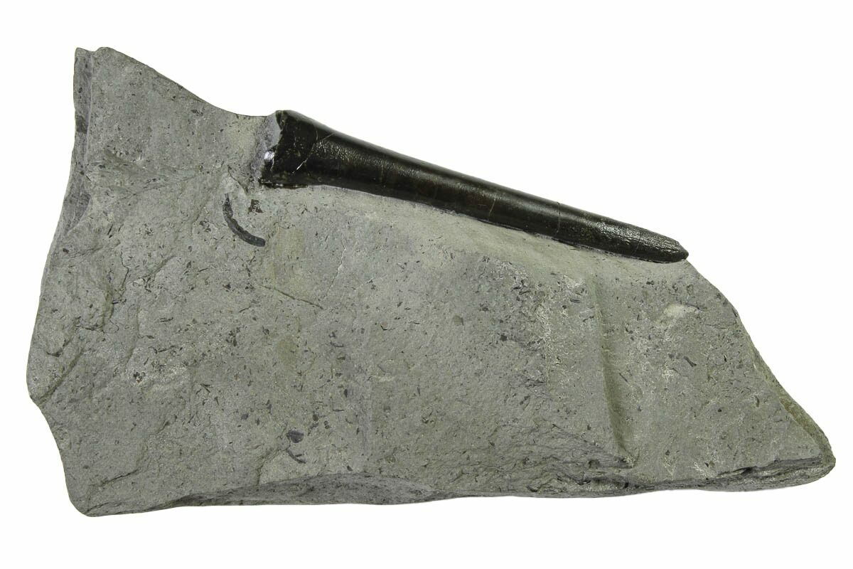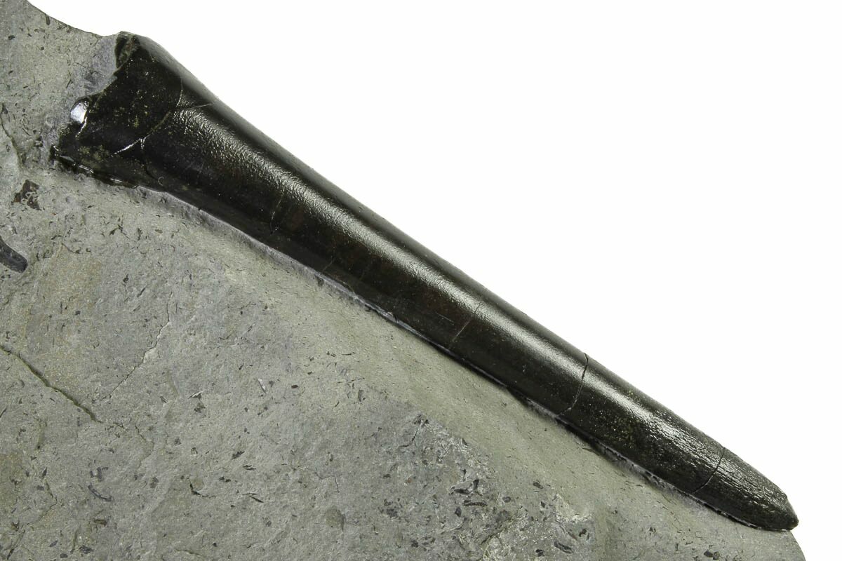 This is a 3.6" long fossil belemnite (Acrocoelites sp.) rostrum from the Jurassic-aged Posidonia Shale of Holzmaden, Germany. The belemnite fossil has been exposed from the rock it was found in.
