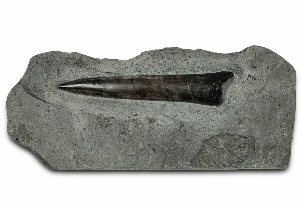 This is a 3.6" long fossil belemnite (Acrocoelites sp.) rostrum from the Jurassic-aged Posidonia Shale of Holzmaden, Germany. The belemnite fossil has been exposed from the rock it was found in.
