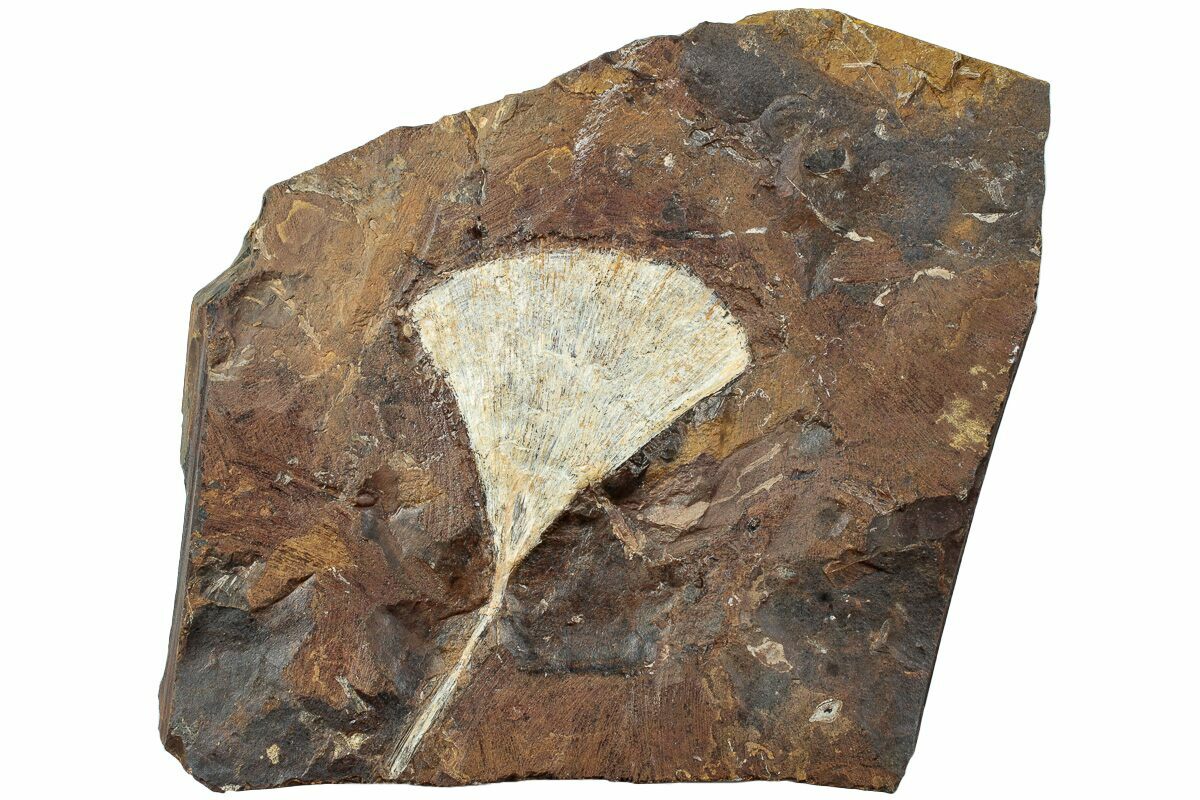 This is a nicely preserved, 3.6" long (including stem) fossil Ginkgo leaf (Ginkgo cranei) from the Sentinel Butte Formation of North Dakota. It is finely detailed and the light preservation contrasts well against the dark orangish-brown rock.