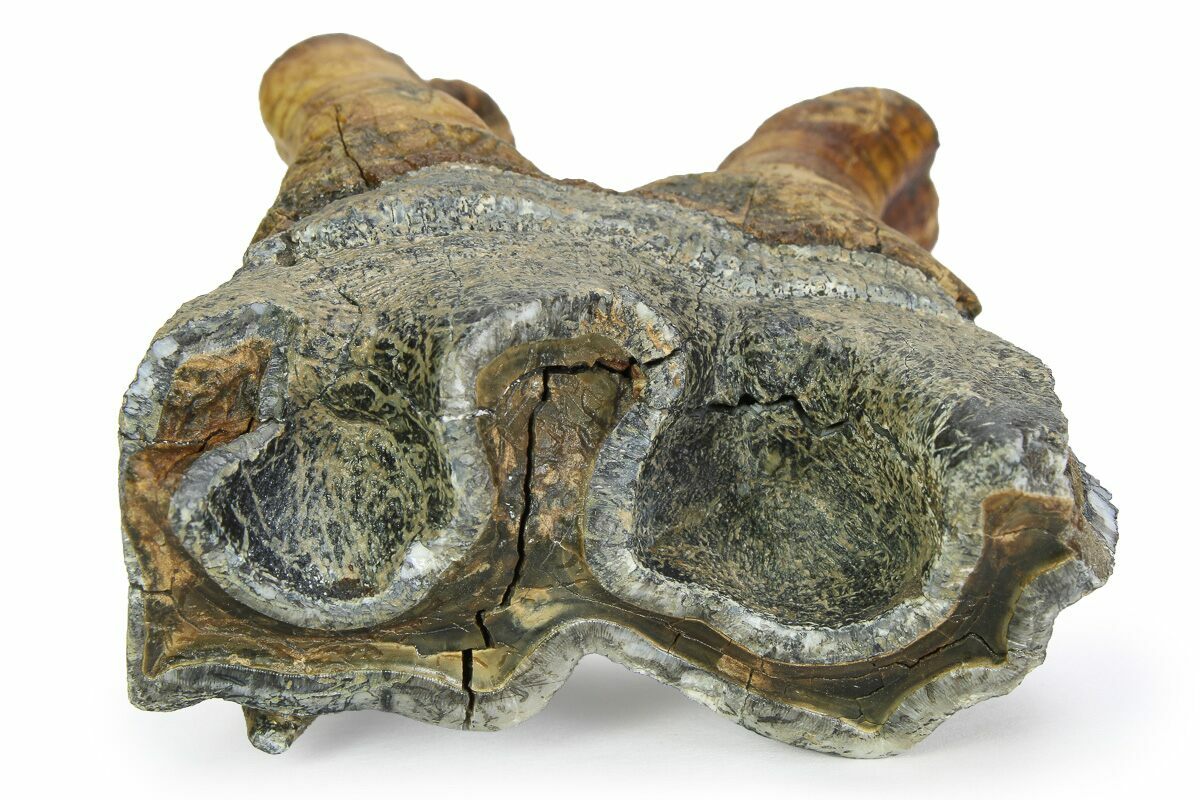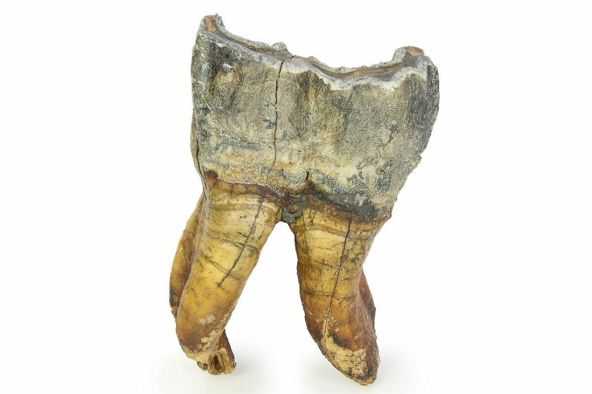 This is a beautifully preserved fossil tooth from a woolly rhinoceros (Coelodonta antiquitatis). The enamel is very well preserved. This fossil comes from Siberia, Russia, where many woolly mammoth and woolly rhino fossils are unearthed. The tooth is mostly complete and has all of its root intact. Including the root, the tooth measures 3.6" tall.