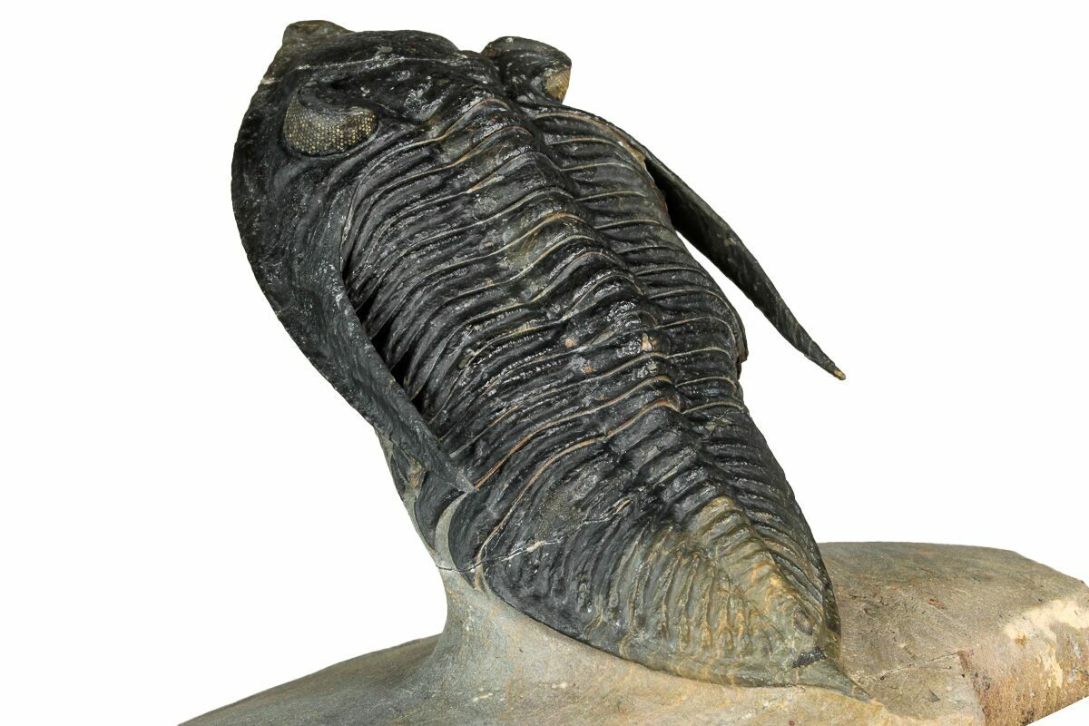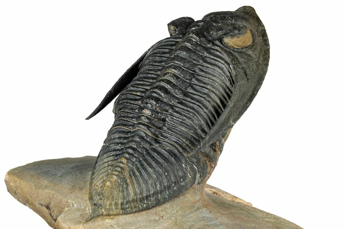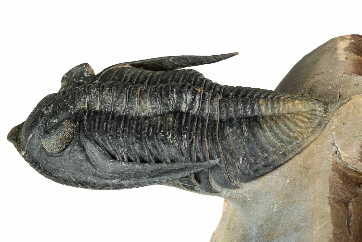 This is an impressive, 3.6" long prone trilobite (Zlichovaspis rugosa) collected from the Lhandar Formation near Atchana, Morocco. Nearly all of the hard limestone has been painstakingly been removed from around the fossil, leaving if "flying" above the rock. The eye facets in the right eye are preserved in orange calcite, a features sometimes seen in trilobites from this locality. Total shell restoration is about 2% along repaired racks.