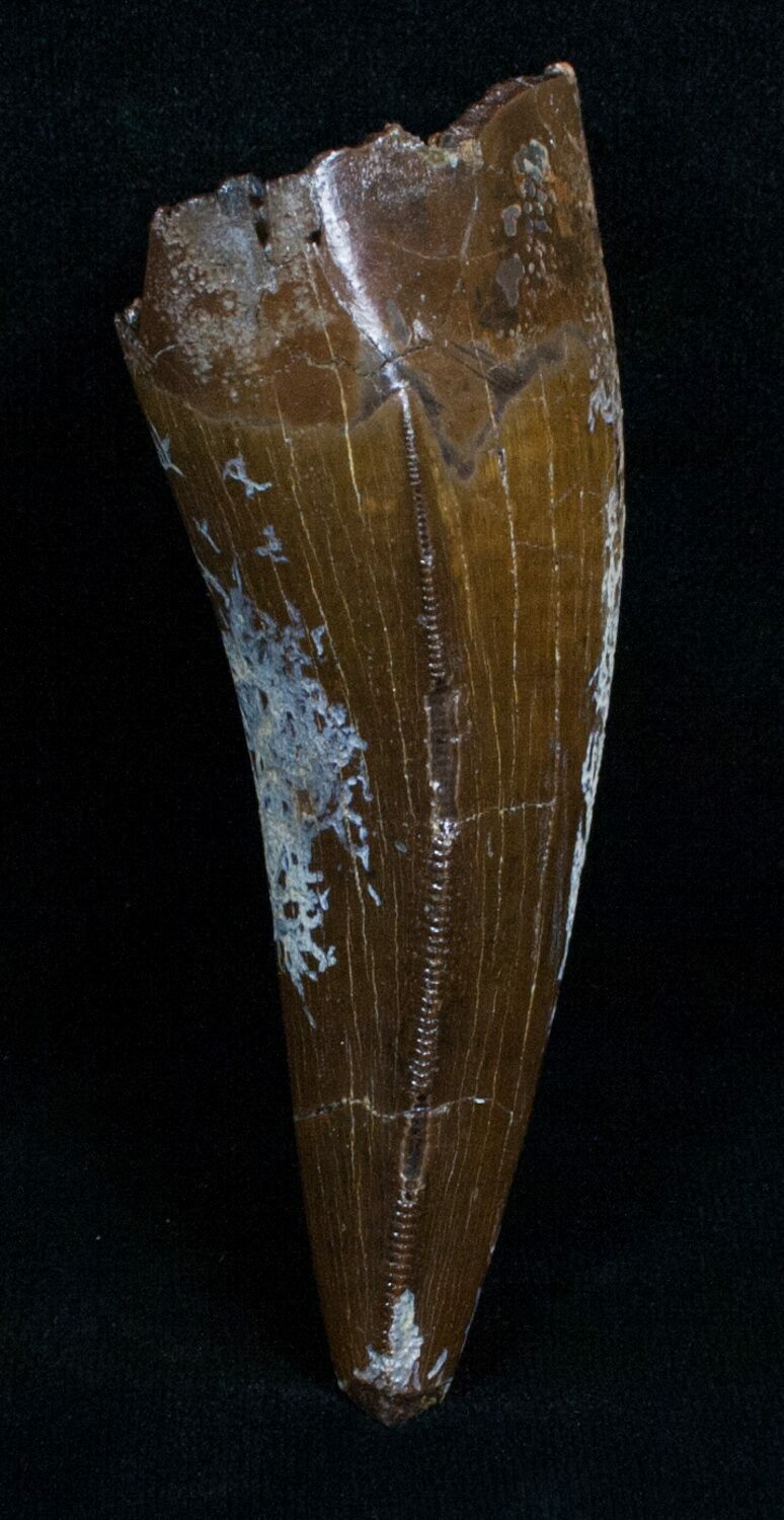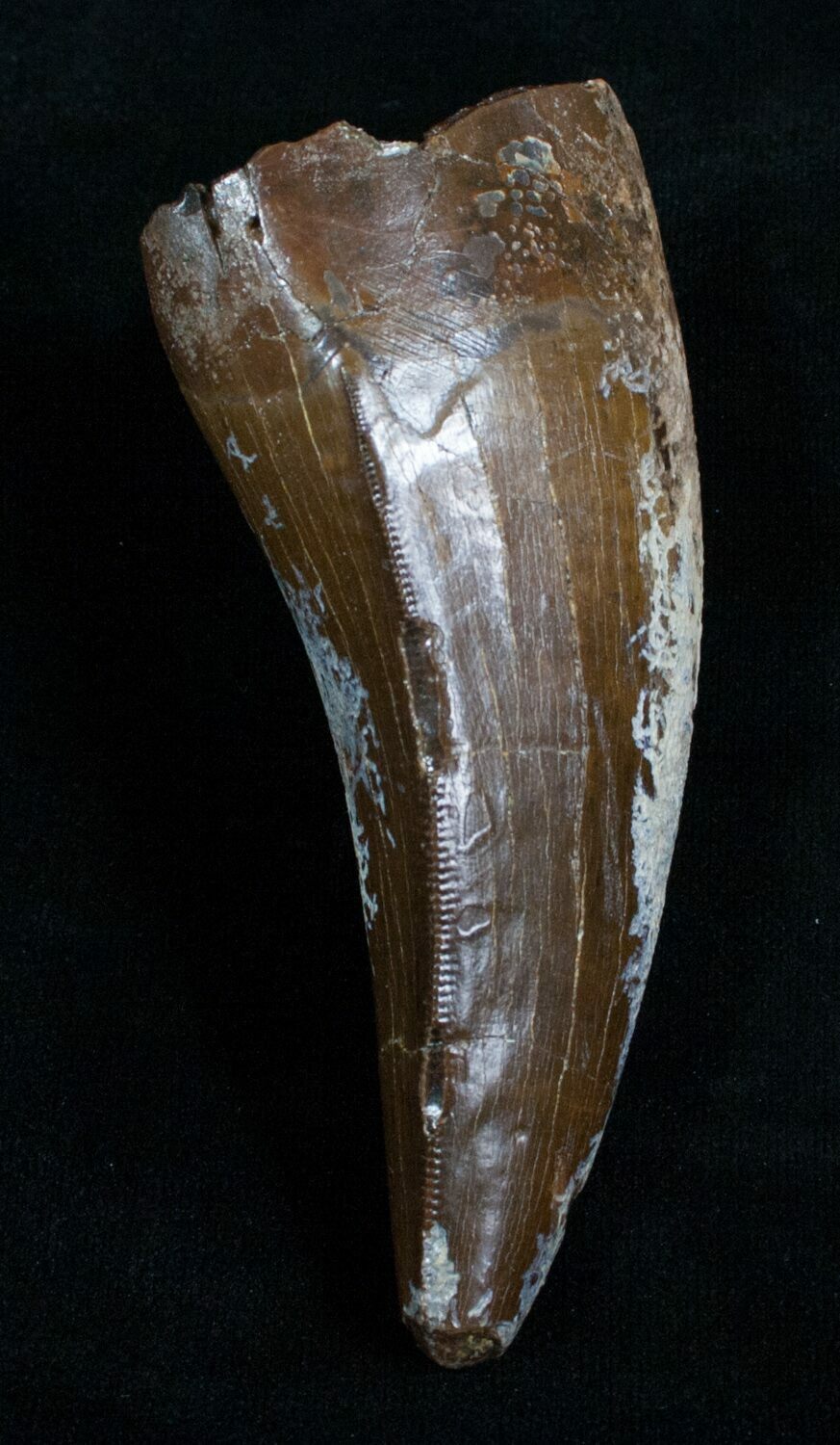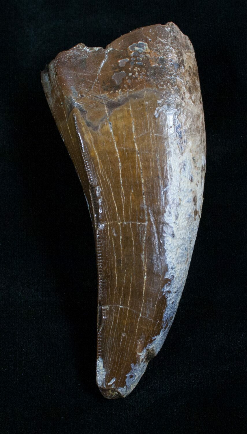 High quality Tyrannosaurus rex teeth are not only hard to find but are probably the most collectable type of fossil there and tend to get snapped up as soon as they hit the market. This one is in excellent shape, is 3.60" long (straightline), and extremely thick. Much of the enamel is in good shape. The serrations are present on both edges of the tooth. There is only very minimal repair and just a tiny bit of restoration near the base. Not only is this a rare, hard to acquire tooth but it is in excellent shape overall.