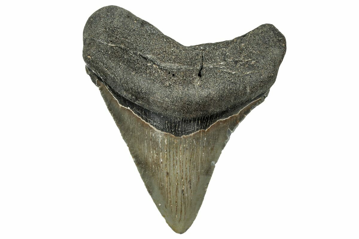 The standard measure for megalodon teeth is slant height, or the longest edge of the tooth. Adult megalodon teeth were typically in the 4 to 5 inch range: teeth over 6 inches are rare and represent super-sized individuals. Only a handful of teeth have ever been found over seven inches.