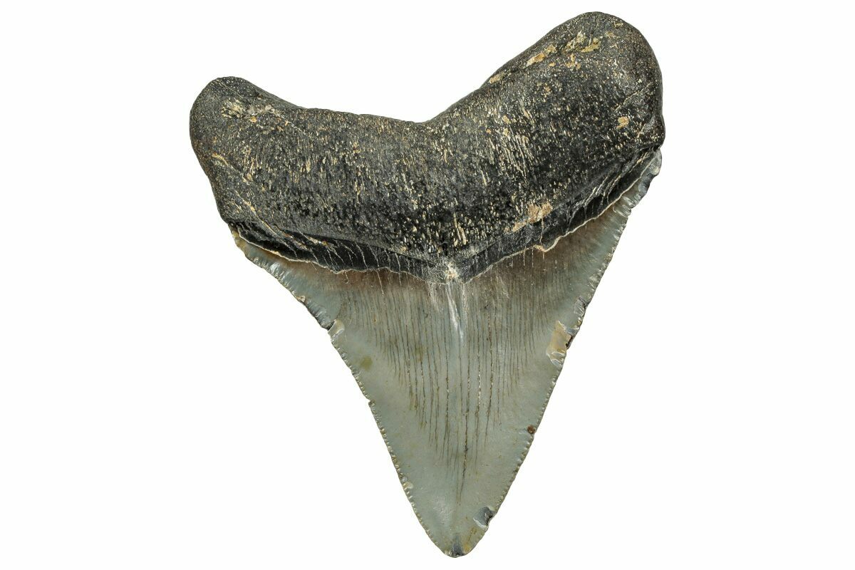This is a 3.63" long megalodon tooth collected on the North Carolina coast. It was found by commercial divers collecting "the ledges" in about 100 feet of water. The tooth would have eroded out of the Pungo River Formation when sea levels were lower and the area where these teeth are found was at the shoreline. The fossil tooth itself would be from between 13.8 to 16 million years old. A tooth of this size would have come from a prehistoric, mega-shark in the 30 foot size range.