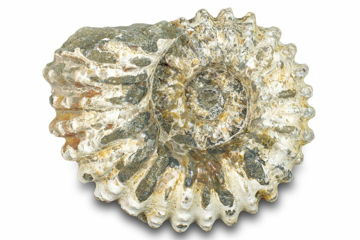 Ammonites were ancient marine cephalopods, similar to today's squids and octopuses, but with a defining feature: their distinctive, tightly coiled spiral shells. These shells, resembling those of modern nautiluses, served as both a protective home and a buoyancy aid, allowing ammonites to navigate the prehistoric seas with ease. First emerging around 240 million years ago in the Triassic Period, ammonites thrived for over 175 million years, adapting through numerous forms and sizes. As predatory creatures, they likely fed on smaller marine organisms, using their tentacles to capture prey. However, their long reign came to an end 65 million years ago at the close of the Cretaceous, coinciding with the mass extinction event that also eliminated the dinosaurs.