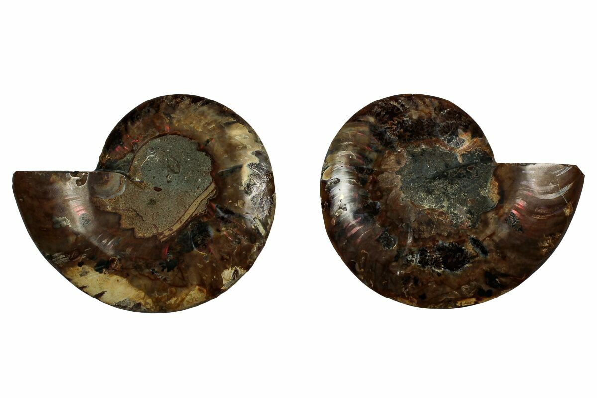 his is a beautiful 3.65" wide, cut and polished Cleoniceras ammonite from Ambatolafia, Madagascar, dating to the Albian Stage of the Late Cretaceous (~110 million years old). Its chambers reveal striking mineralization bordered by white calcite septa, creating an elegant, highly polished display piece. Both halves are included, along with display stands.