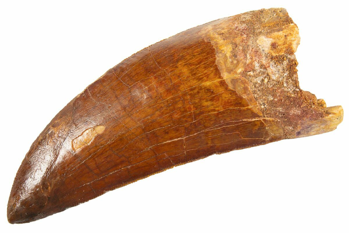This is a large, serrated, 3.65" long tooth of a Carcharodontosaurus from the Late Cretaceous, Kem Kem Beds of Morocco. Carcharodontosaurus was an enormous predatory dinosaur larger than Tyrannosaurus rex.