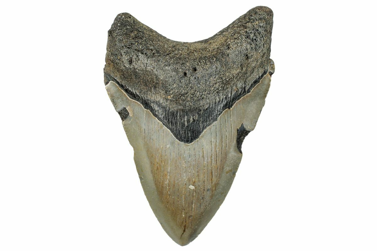 This is a 3.67" long Megalodon tooth collected on the North Carolina coast. It was found by commercial divers collecting "the ledges" in about 100 feet of water. The tooth would have eroded out of the Pungo River Formation when sea levels were lower and the area where these teeth are found was at the shoreline. The fossil tooth itself would be from between 13.8 to 16 million years old. A tooth of this size would have come from a prehistoric, mega-shark in the 25-30 foot size range.