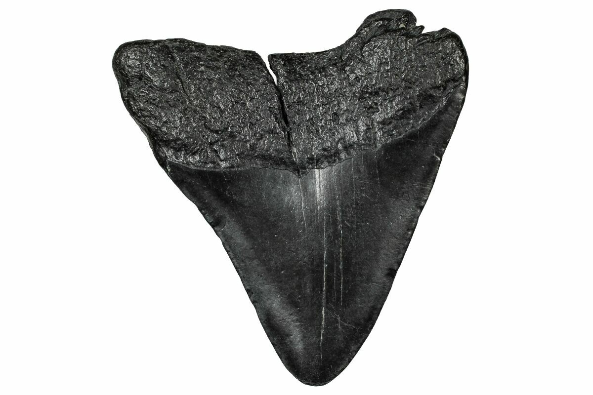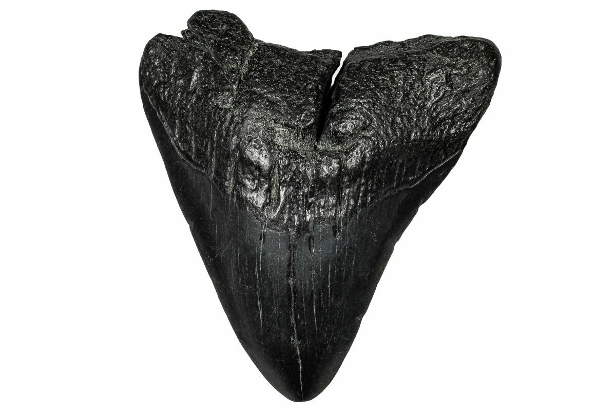 This is a 3.67" long, fossil megalodon tooth collected in South Carolina. The tooth would have come from an adult, prehistoric, mega-shark in the 35+ foot size range.