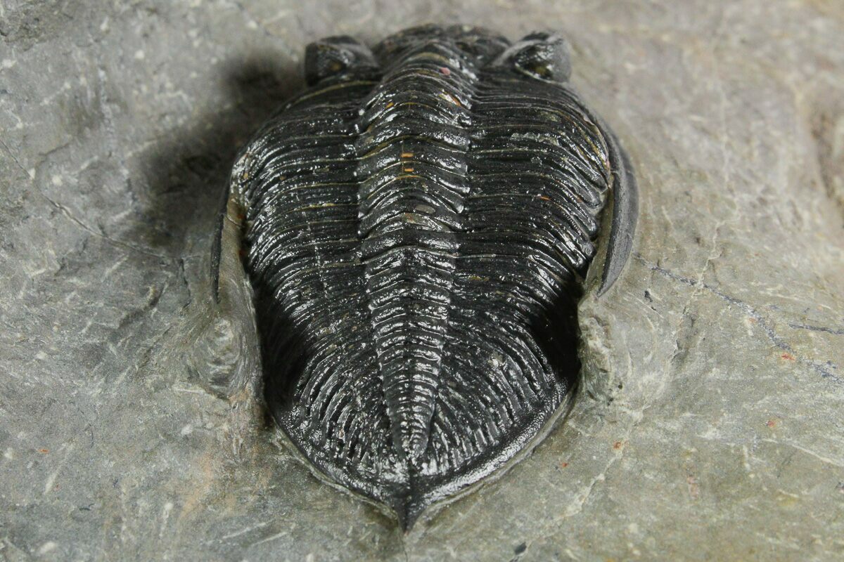 This is a really cool natural, trilobite association from the Lhandar Formation near Atchana, Morocco. There is a large and colorful, 3.7" long Crotalocephalina gibbus along with a 2.7" Zlichovaspis rugosa. The hard limestone has been artistically sculpted to present the trilobites well. Total restoration is about 1-2% on the Crotalocephalina along repaired cracks and the Zlichovaspis has no restoration.