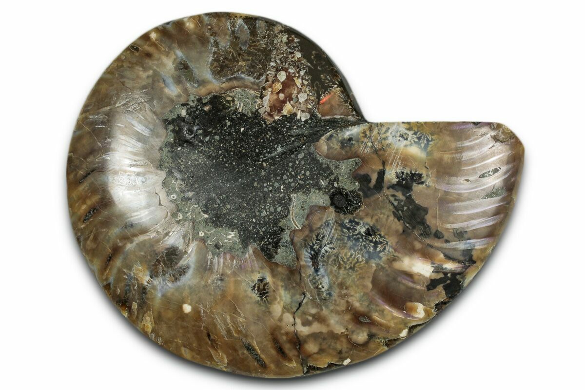 Here is a beautiful, 3.7" wide, cut and polished Cleoniceras ammonite fossil from Madagascar. These ammonites are Cretaceous in age, approximately 110 million years old. This specimen exhibits gorgeous mineralization within the chambers, each separated by white calcite septa (divisions). This highly polished, exotic ammonite makes a superb display piece with tremendous historical appeal.