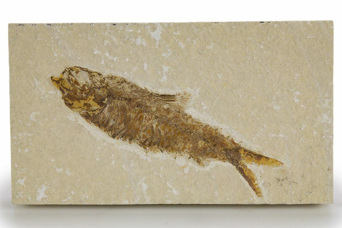 This is a 3.7" long fossil fish (Knightia eocaena) from our Fossil Lake Safari quarry near Kemmerer, Wyoming. Its bone structure, fins, and scale structure are visible.
