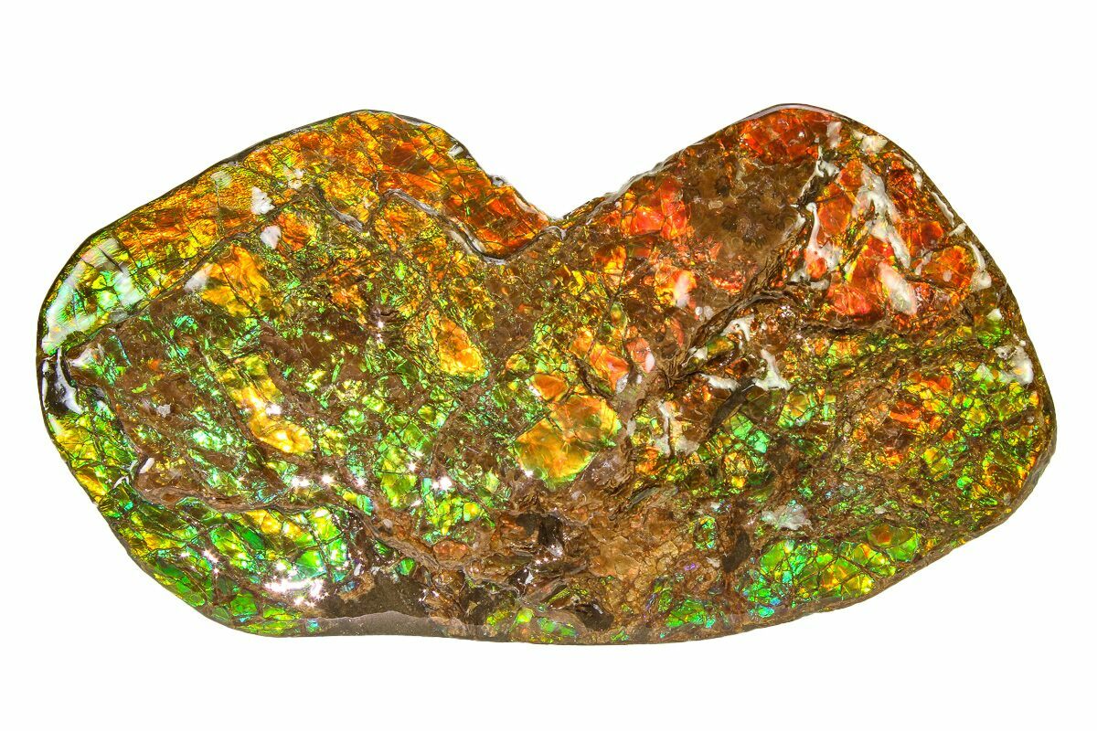 Ammolite is an opal-like gemstone found primarily in Alberta, Canada. It is a kind of fossilized shell from ammonites, which in turn are composed primarily of aragonite, the same mineral contained in nacre (mother-of-pearl). The shell's microstructures are often preserved. In 1981, ammolite was given official gemstone status by the World Jewellery Confederation (CIBJO).