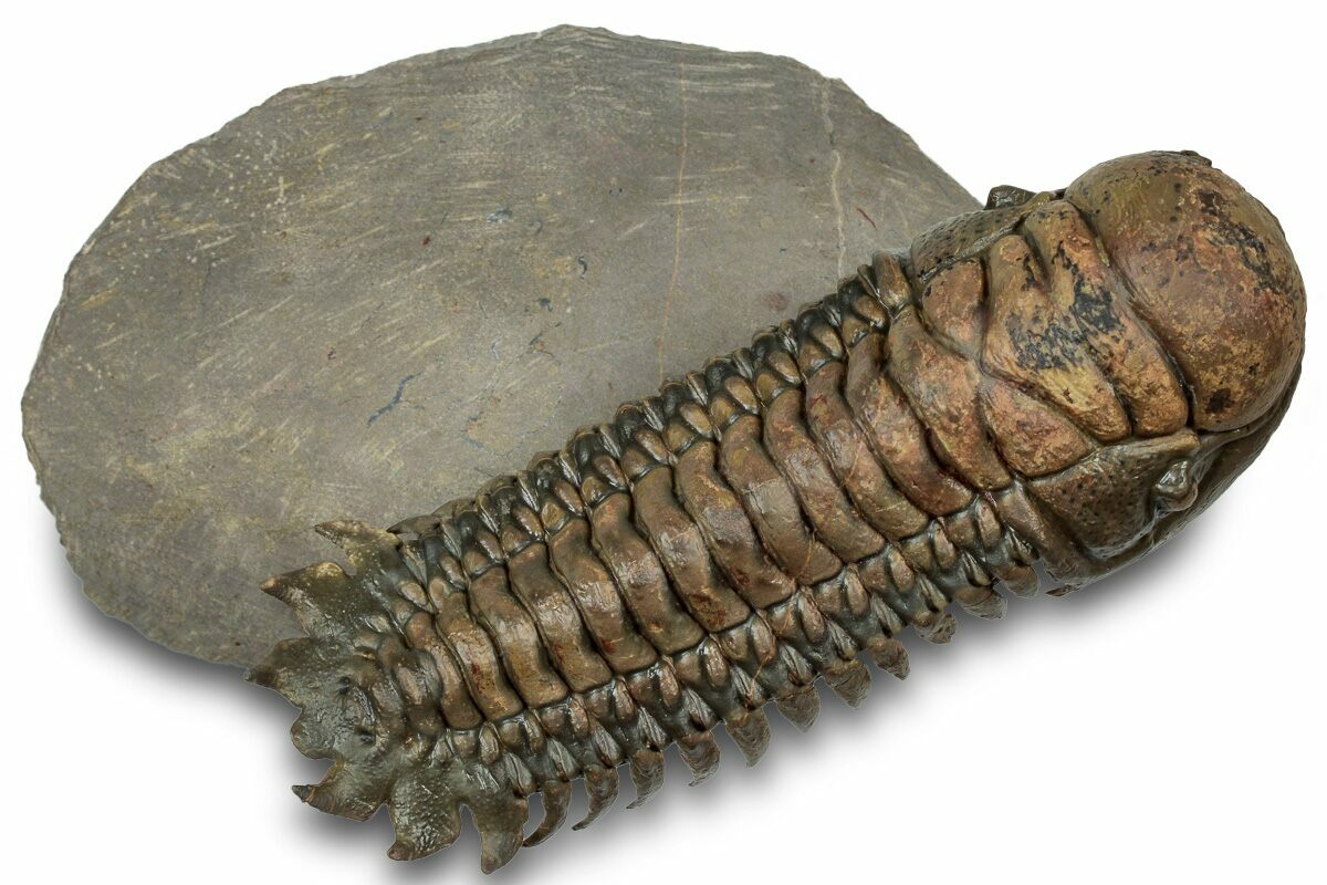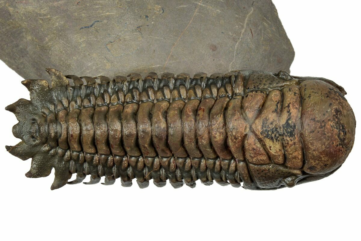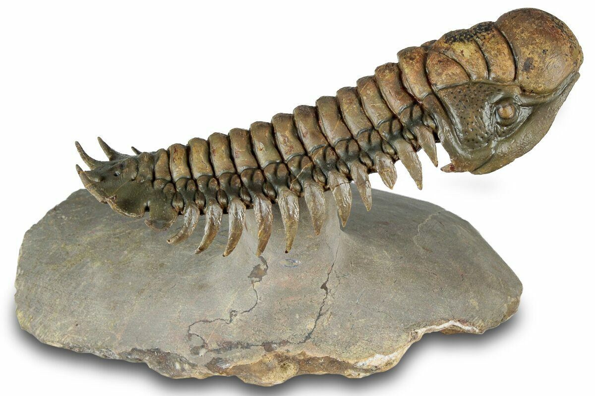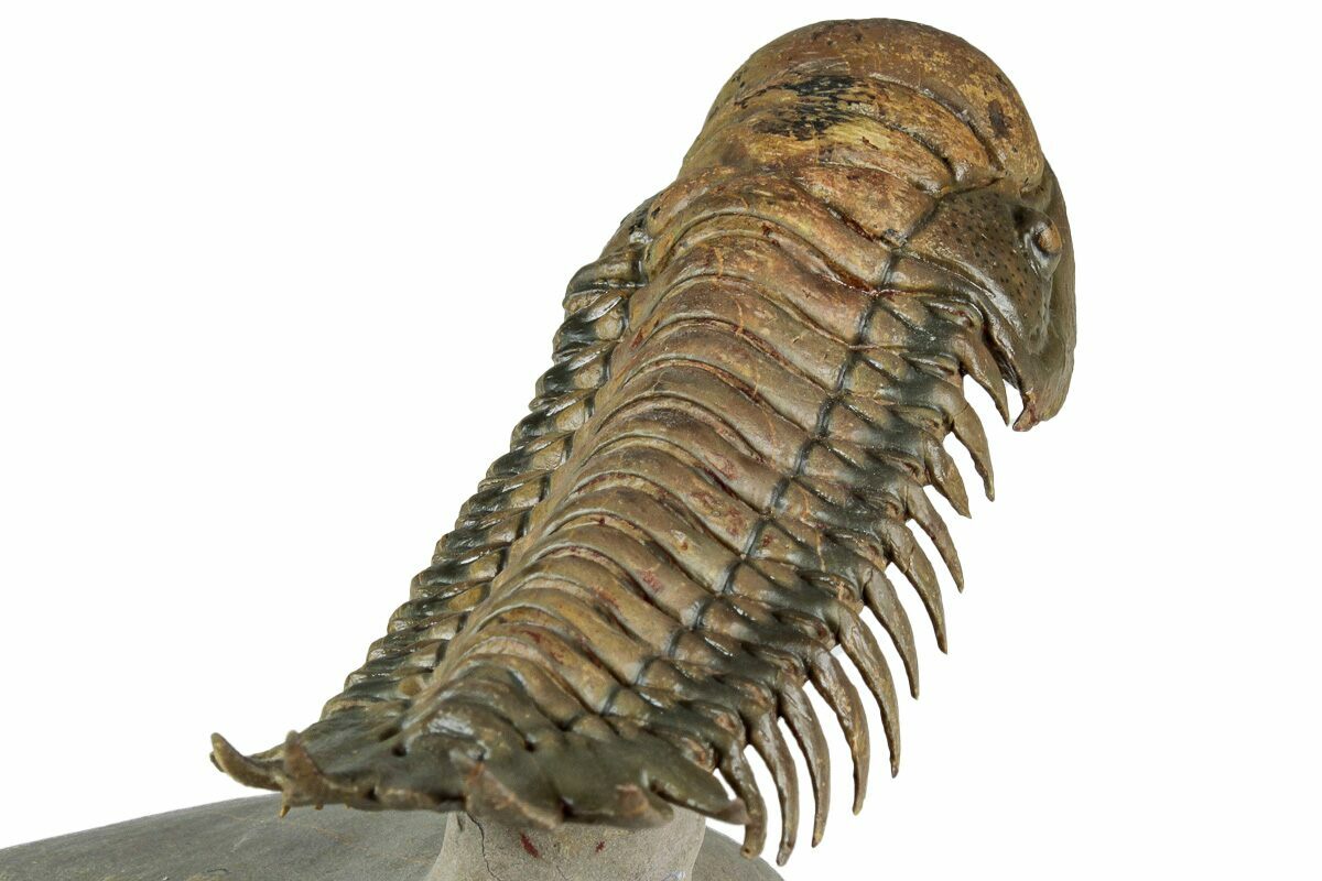 This is an impressive, 3.7" long specimen of Crotalocephalina gibbus from Atchana, Morocco. Nice preparation and shell detail. It has been prepared in a "flying" pose by removing nearly all of the surrounding limestone. This leaves it floating above the rock on a pedestal. The preparation takes lot of time but the results are quite spectacular.