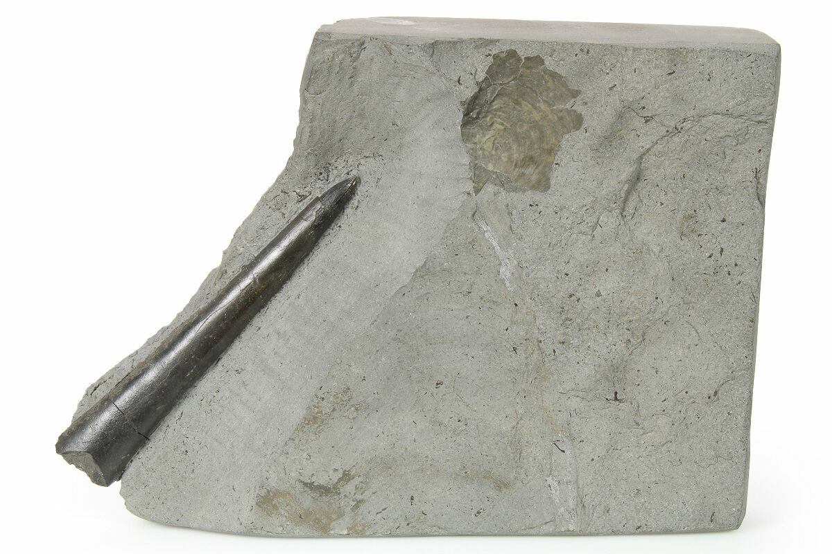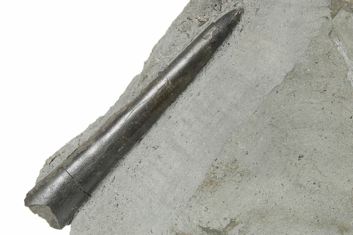 This is a 3.7" long fossil belemnite (Acrocoelites sp.) from the Jurassic-aged Posidonia Shale of Holzmaden, Germany. The belemnite has been exposed from the rock it was found in.