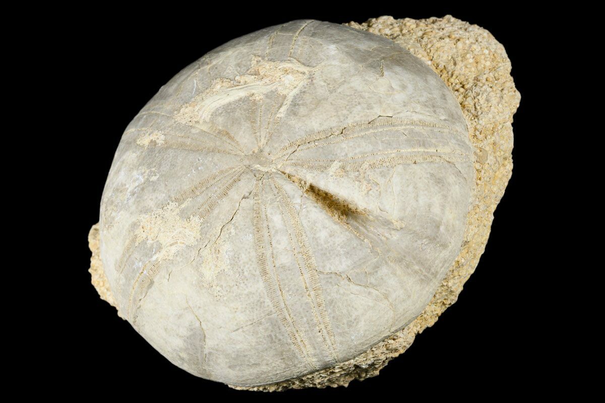 This is a very displayable fossil sea urchin (Clypeus plotti) that was collected near Stow-on-the-Wold in Gloucestershire, England. It comes from Middle Jurassic, Bajocian age Clypeus Grit Member of the Inferior Oolite, and is approximately 168 million years old. The sea urchin is partially embedded in the rock it was found in. The base has been cut, resulting in aesthetic presentation of the sea urchin using the rock.