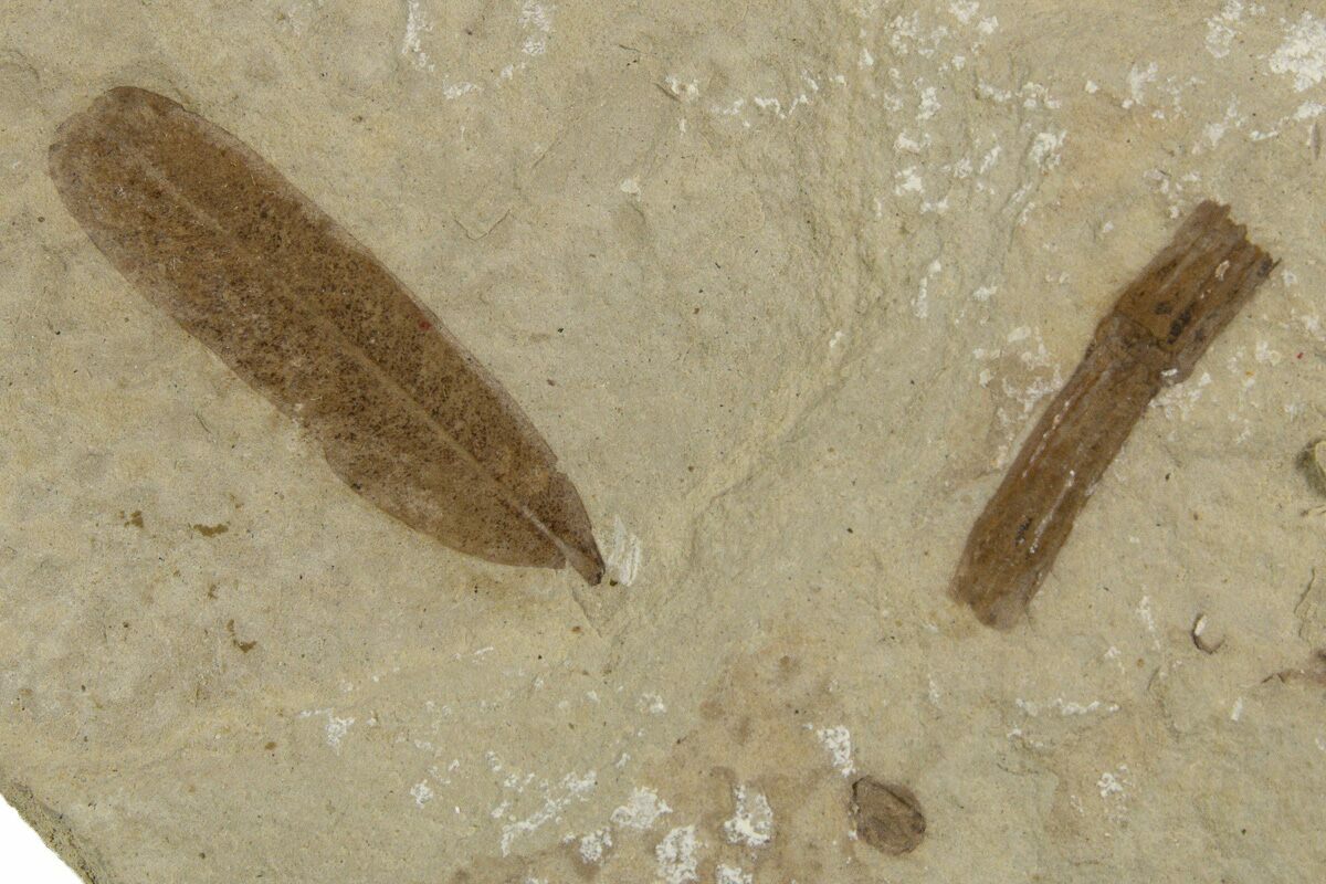 This is a 3.7" wide slab of shale containing multiple flora fossils. The two leaves are of the species Mimosites coloradensis and Equisetum winchesteri which are preserved alongside horsetail fossils of the species Equisetum winchesteri. This specimen was collected from the Green River Formation in Utah.