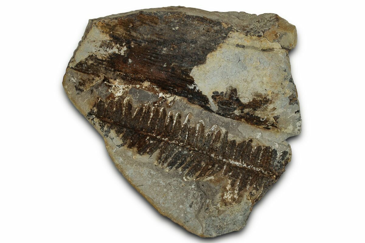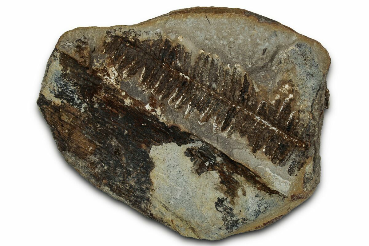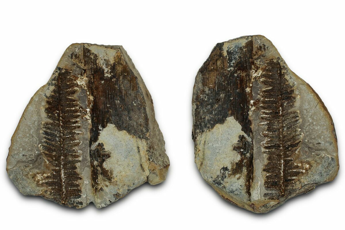 This is a 3.7" wide fossil fern (Pecopteris sp.) and horsetail (Calamites sp.) nodule from the Carbondale Formation (Francis Creek Shale) in Illinois. The fossils are preserved inside an ironstone nodule associated with the famous Mazon Creek Lagerstätte. Under magnification the detail of this specimen stands out. Both the positive (convex) and negative (concave) sides of the fossil nodule are included along with a pair of display stands.