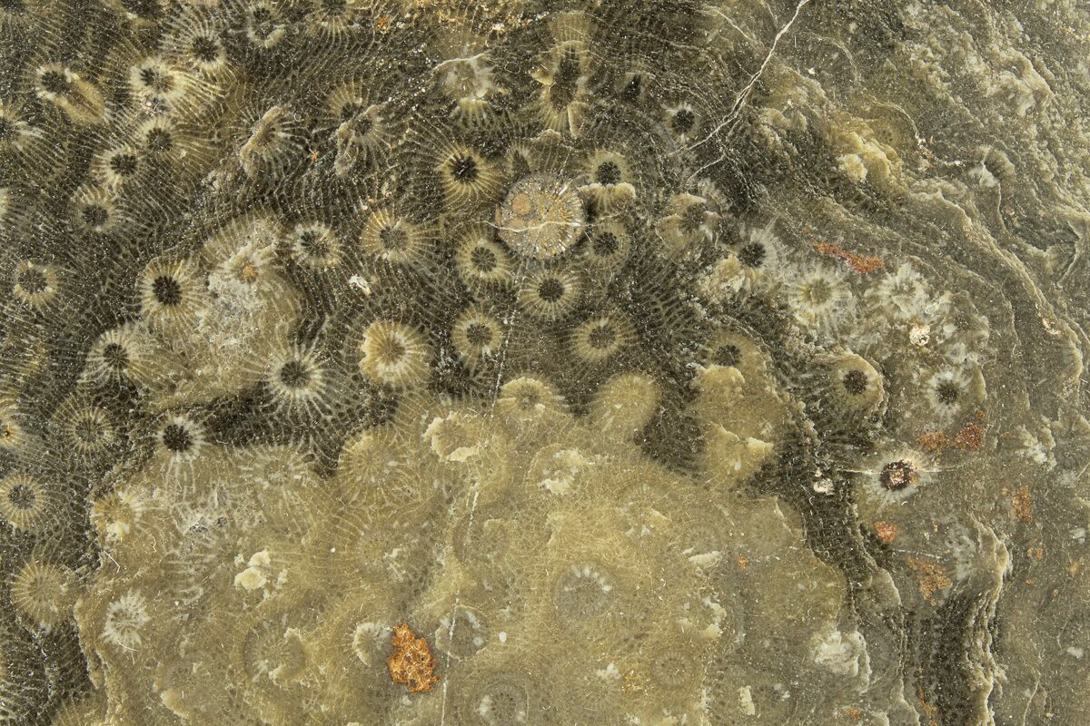 This region in Western Sahara, Morocco was dominated by large stromatoporoids (sea sponges), alongside tabulate coral, solitary and colonial rugose corals, and a wide variety of reef-dwelling organisms. This diverse selection of life makes it difficult to provide an accurate genera/species identification for this coral.
