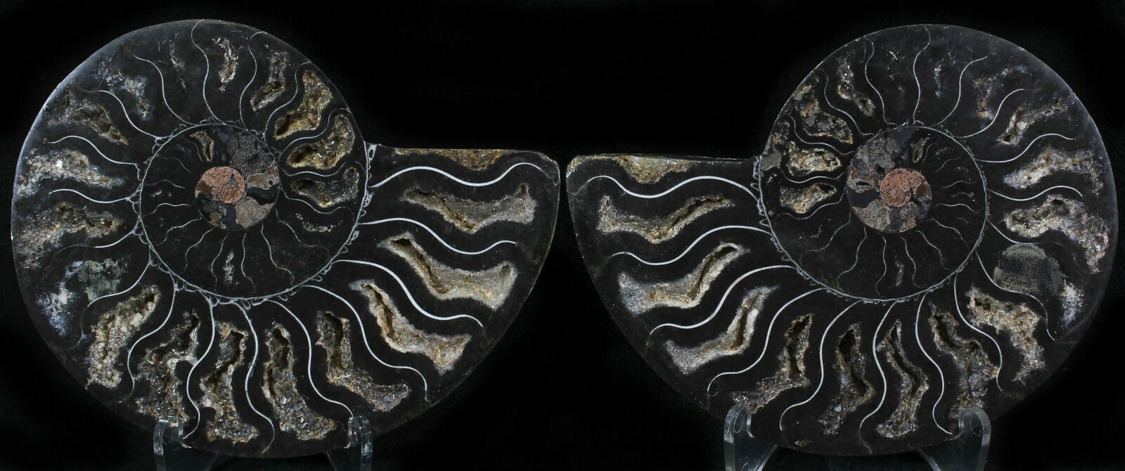 This ammonite is 3.7 inches wide and has been sliced and half and polished to reveal the inner detail. Many of the chambers have been preserved as pockets of crystals.