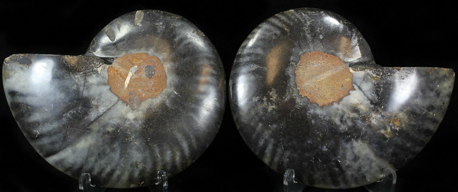 3.7" Split Black/Orange Ammonite Pair - Unusual Coloration