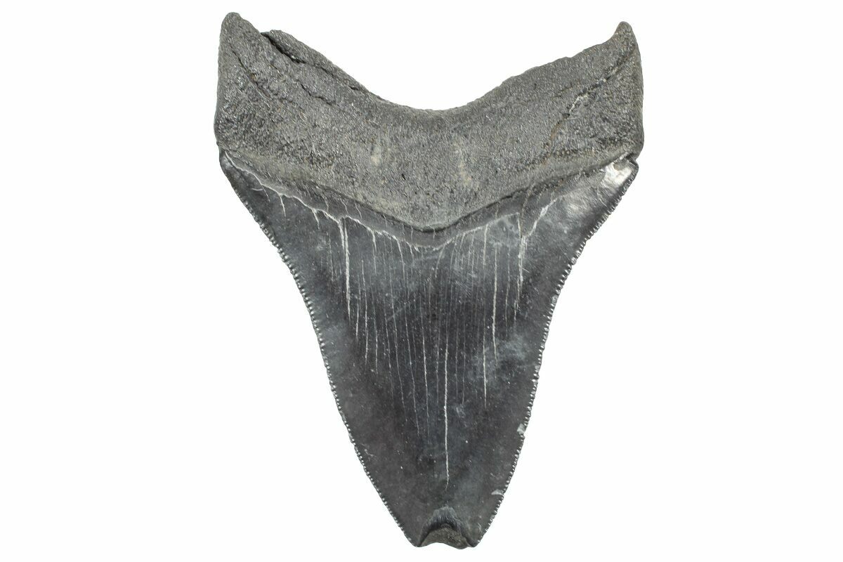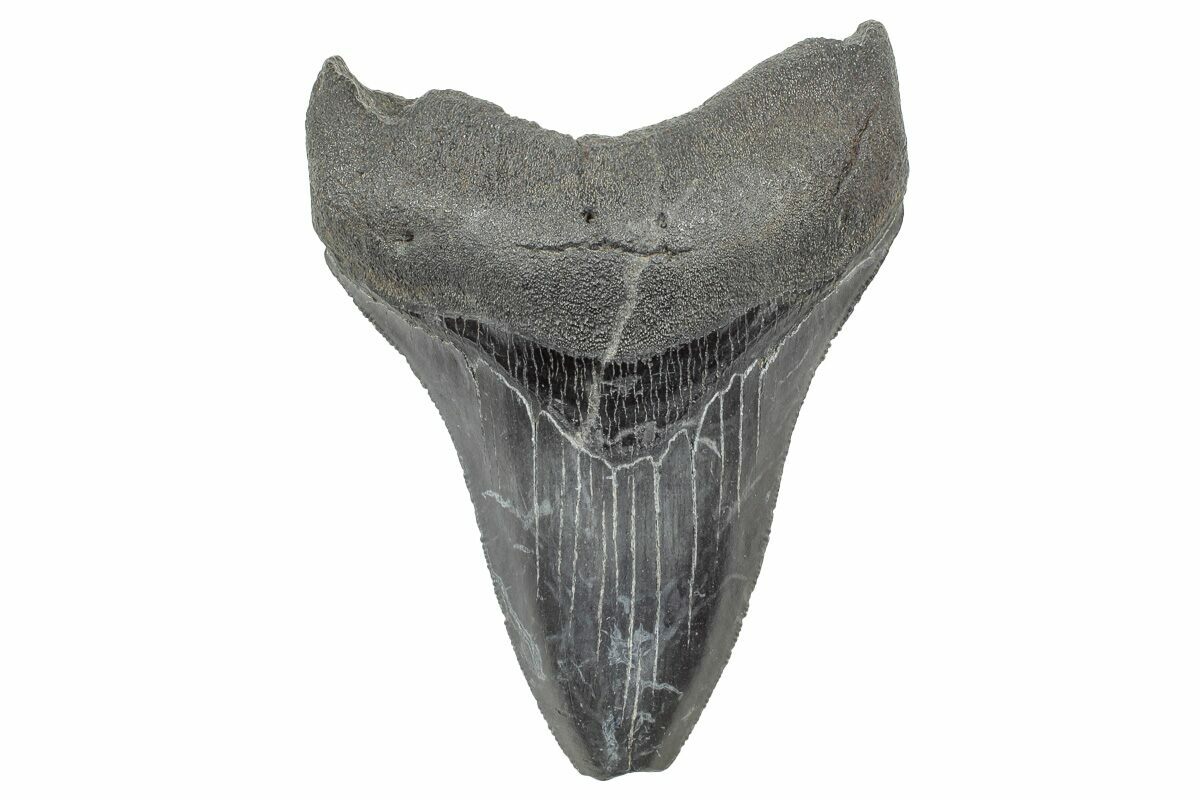 The standard measure for megalodon teeth is slant height, or the longest edge of the tooth. Adult megalodon teeth were typically in the 4 to 5 inch range: teeth over 6 inches are rare and represent super-sized individuals. Only a handful of teeth have ever been found over seven inches.