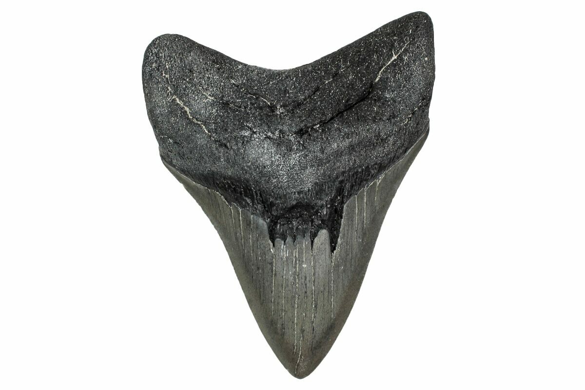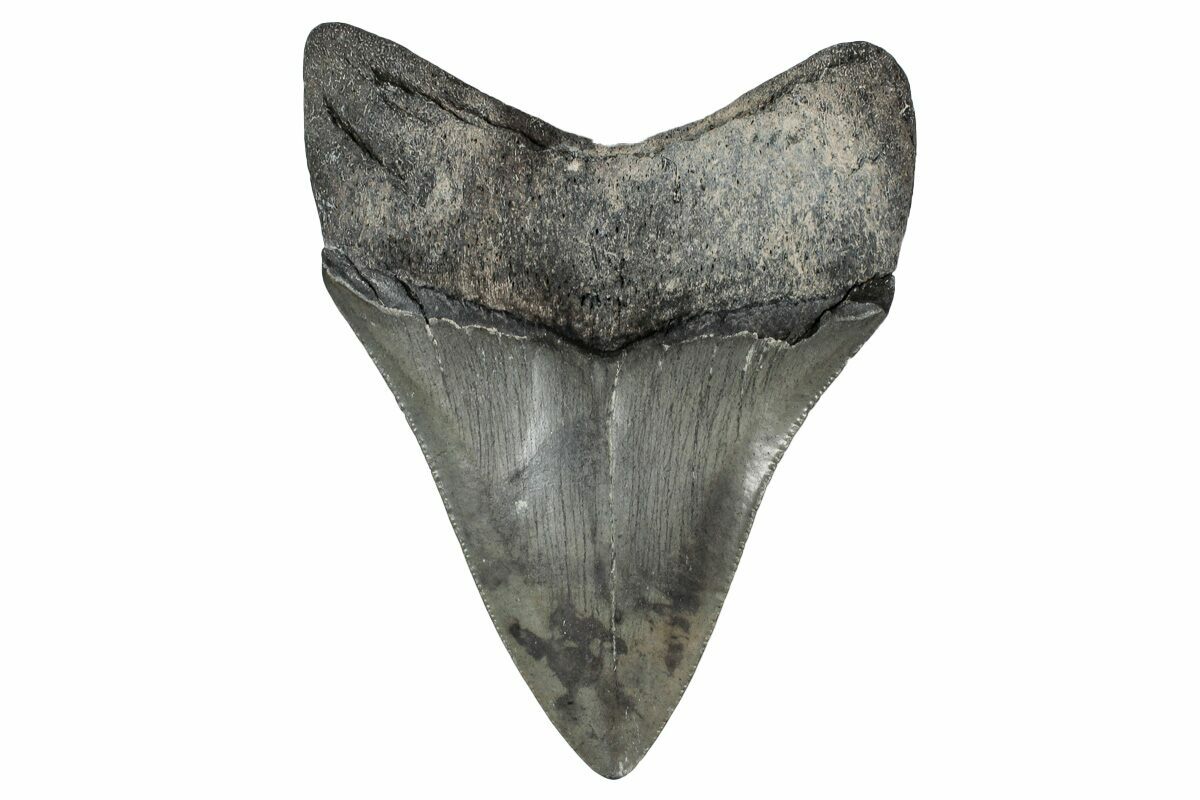 This is a 3.74" long fossil megalodon tooth collected from the Savannah River area along the border of Georgia and South Carolina. The tooth would have come from a prehistoric mega-shark in the 30 foot size range.