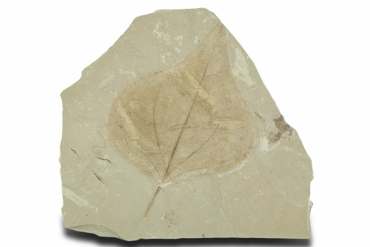 This is a fossil leaf plate from the Green River Formation, Utah. It features a beautiful, 3.75" long (including stem) poplar (Populus wilmattae) leaf with nice detail preservation. The genus Populus includes poplars, cottonwoods, and quaking aspens: this leaf closest resembles cottonwood leaves.