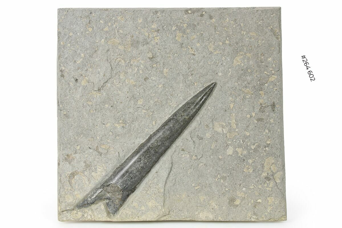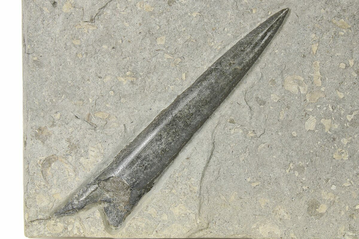 This is a 3.75" long fossil belemnite (Acrocoelites sp.) from the Jurassic-aged Posidonia Shale of Holzmaden, Germany. The belemnite has been exposed from the rock it was found in.