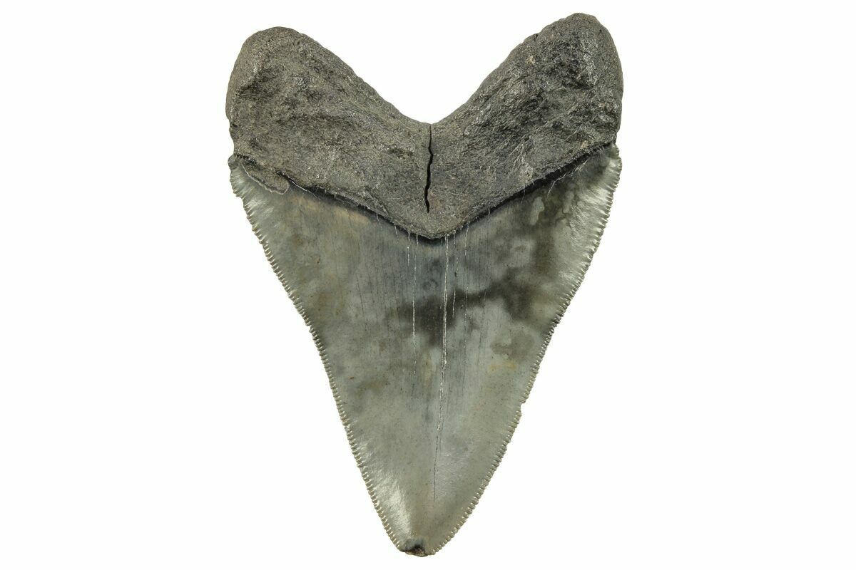 This is a 3.75" long fossil Megalodon tooth collected from a river in South Carolina. The tooth would have come from a prehistoric mega-shark in the 25-30 foot size range.