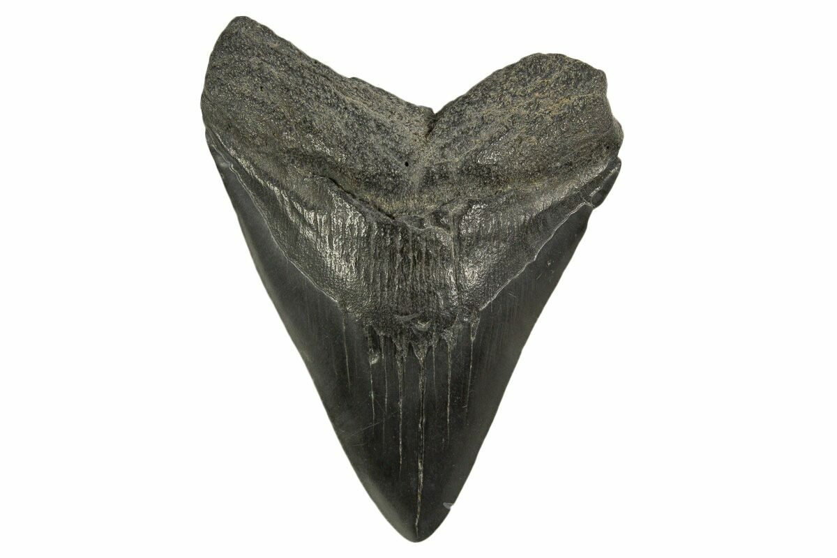The standard measure for megalodon teeth is slant height, or the longest edge of the tooth. Adult megalodon teeth were typically in the 4 to 5 inch range: teeth over 6 inches are rare and represent super-sized individuals. Only a handful of teeth have ever been found over seven inches.