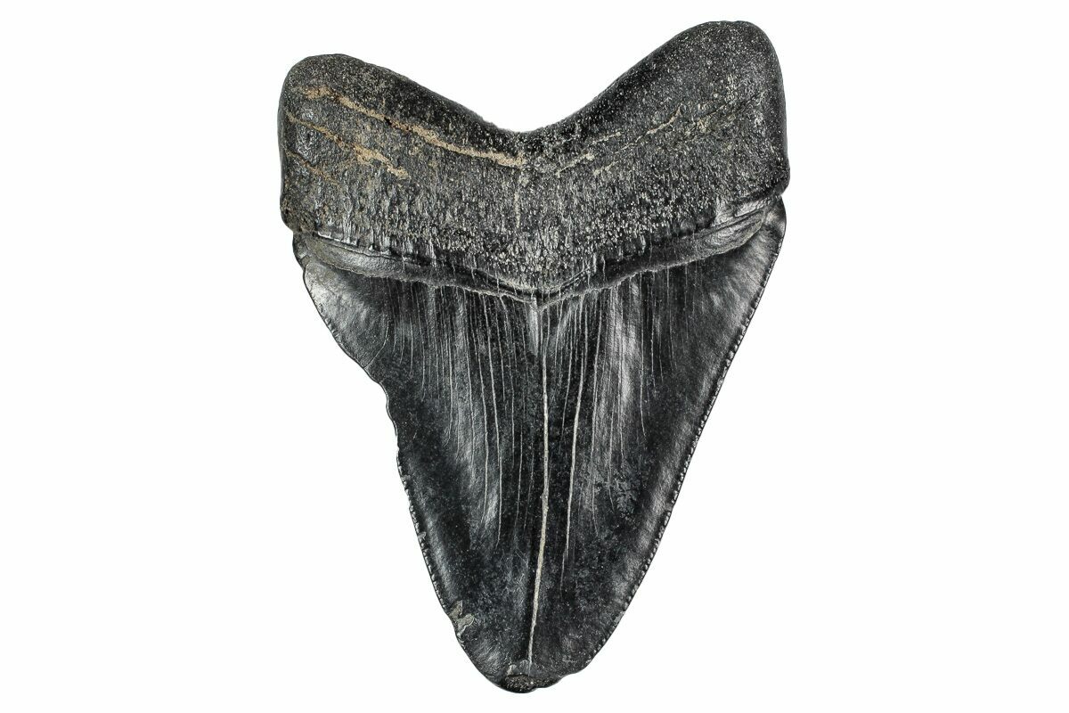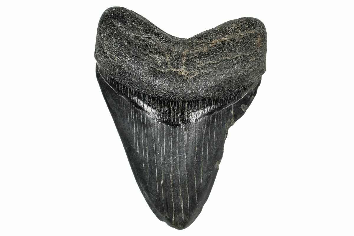 The standard measure for megalodon teeth is slant height, or the longest edge of the tooth. Adult megalodon teeth were typically in the 4 to 5 inch range: teeth over 6 inches are rare and represent super-sized individuals. Only a handful of teeth have ever been found over seven inches.