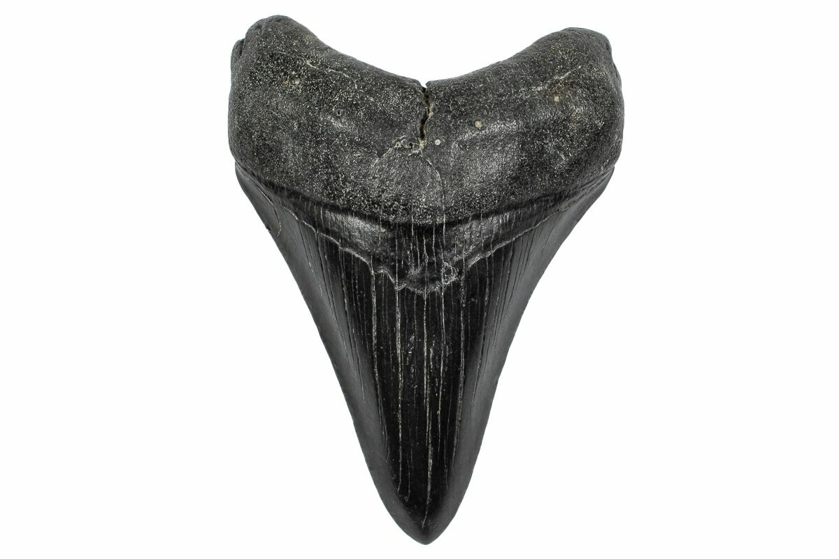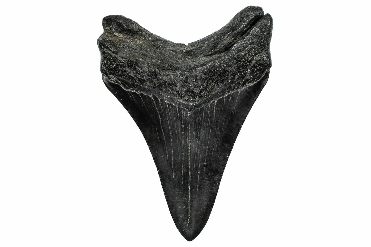 The standard measure for megalodon teeth is slant height, or the longest edge of the tooth. Adult megalodon teeth were typically in the 4 to 5 inch range: teeth over 6 inches are rare and represent super-sized individuals. Only a handful of teeth have ever been found over seven inches.