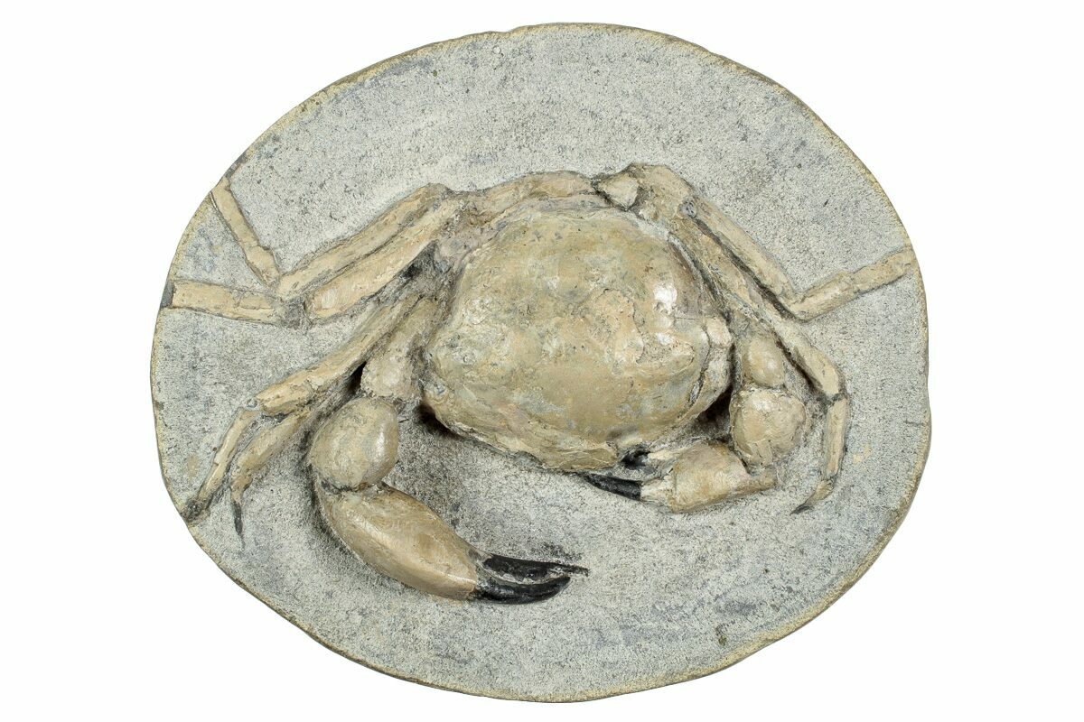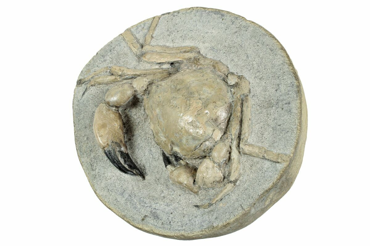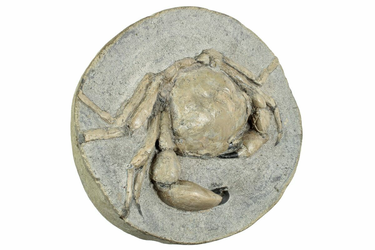 This is a 3.8" wide fossil crab (Pulalius vulgaris) from Southwest Washington. These crabs are found within hard concretions (a mass of rock that forms around organic manner) which must be broken open to find the crab. The crab must then be prepared from the hard concretion using air tools, a very time consuming process.